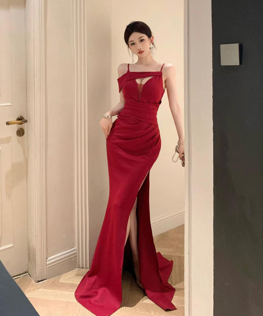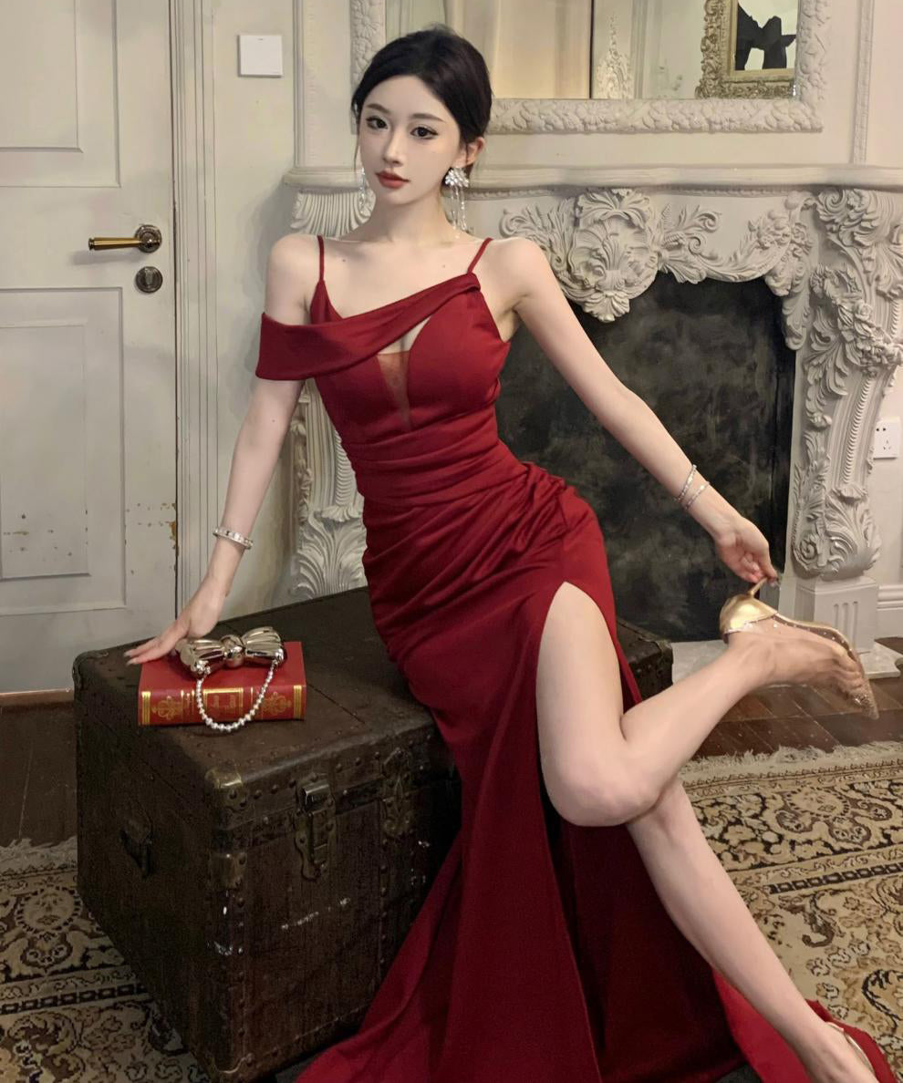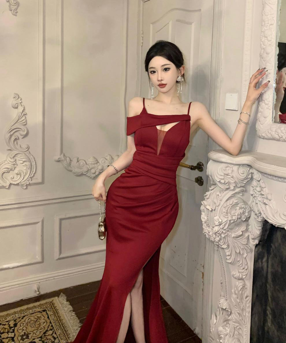 ロングドレス 脚長効果 ワインレッド 宴会 着痩せ 気質 セクシー YH2-ZED888390DXH238A