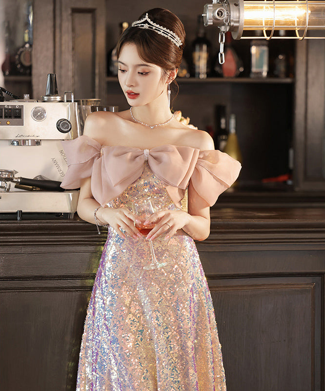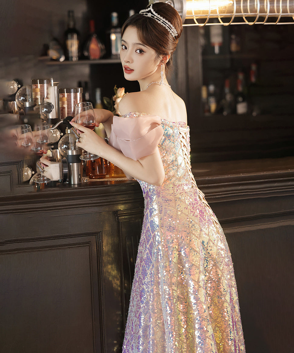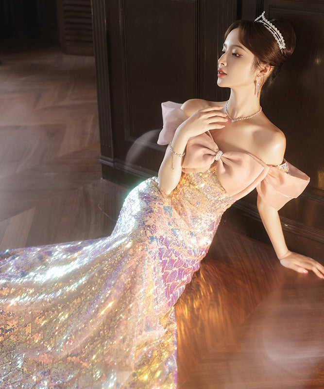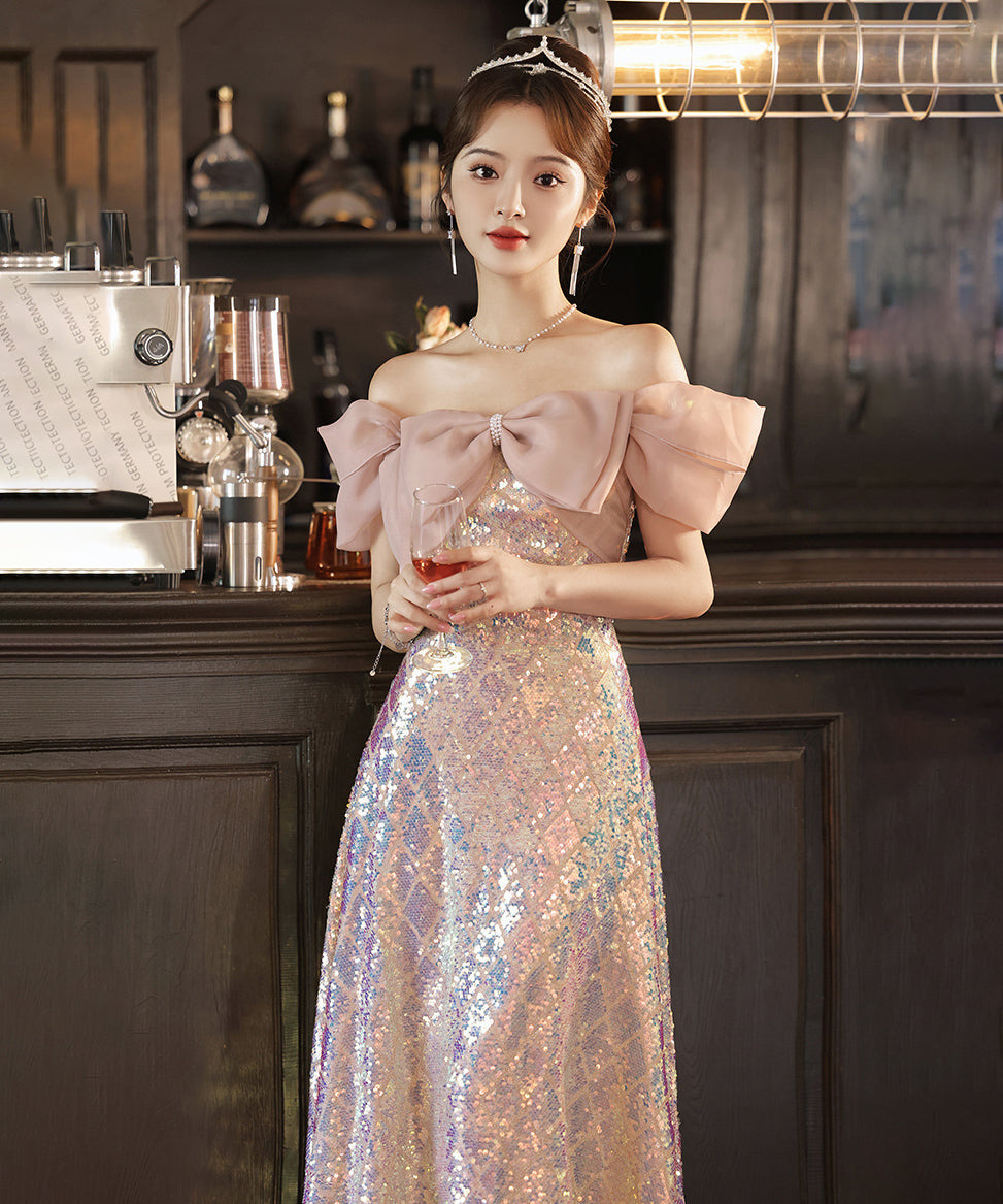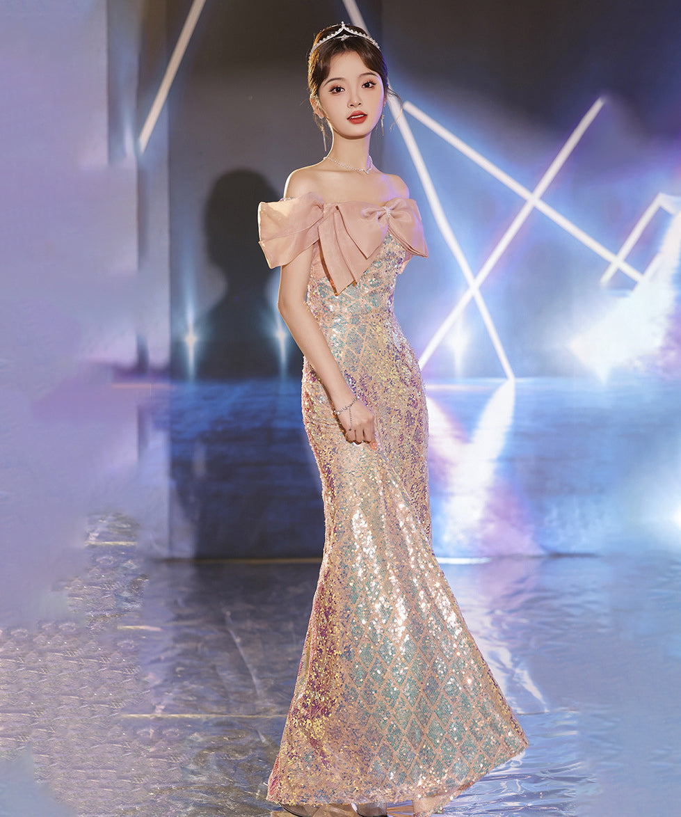 ロングドレス 誕生日パーティー キラキラ 人魚姫 リボン オフショルダー 演奏会 宴会 XH2-WS-P108