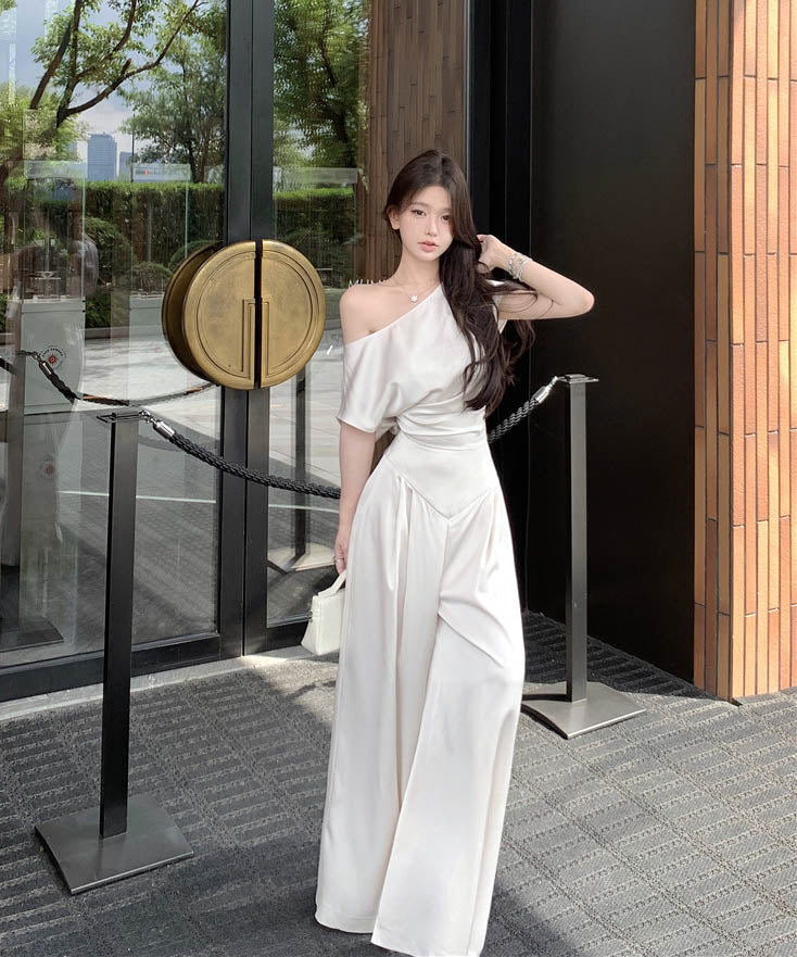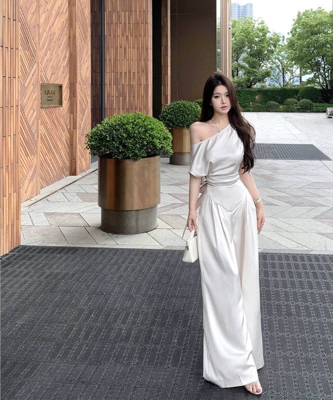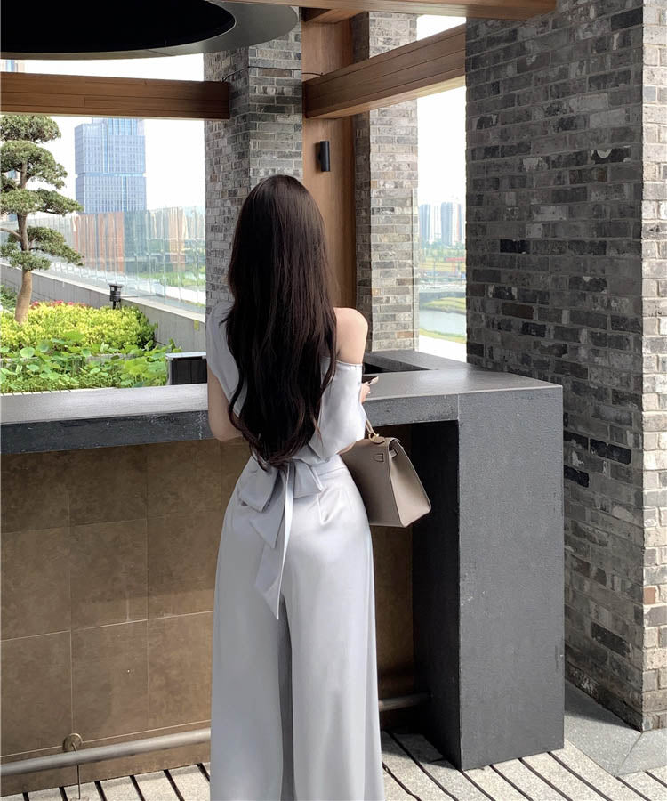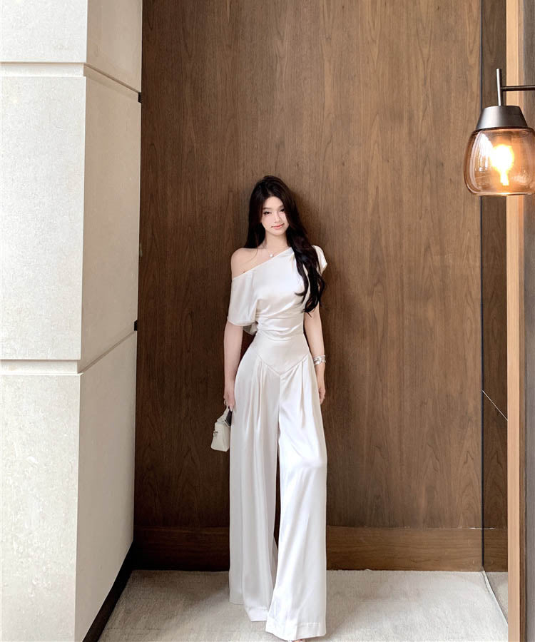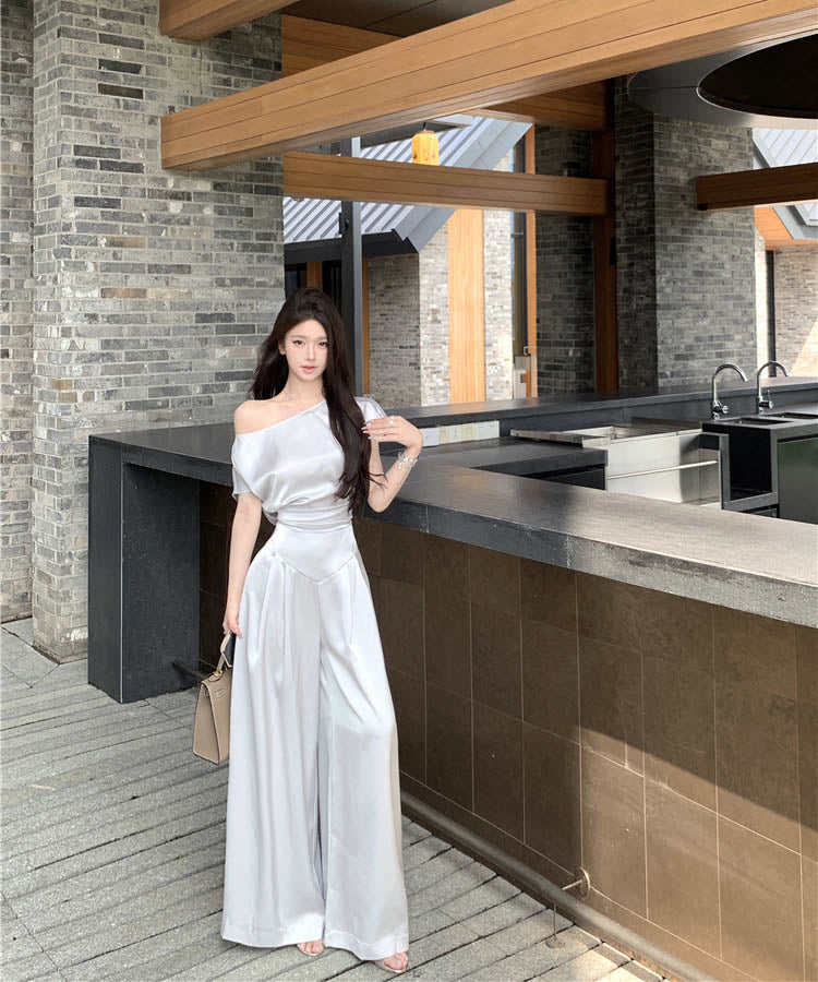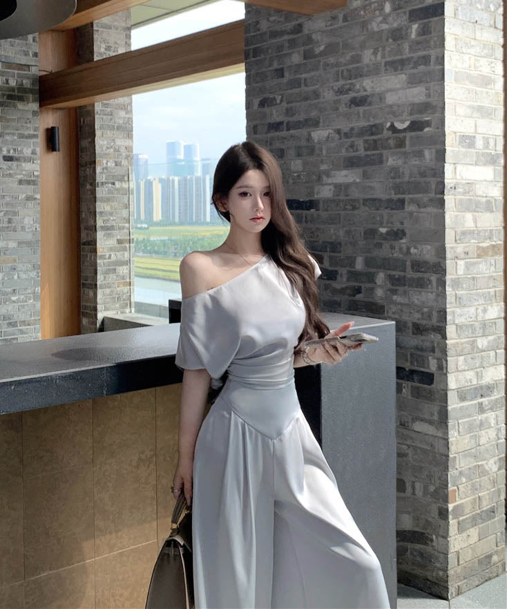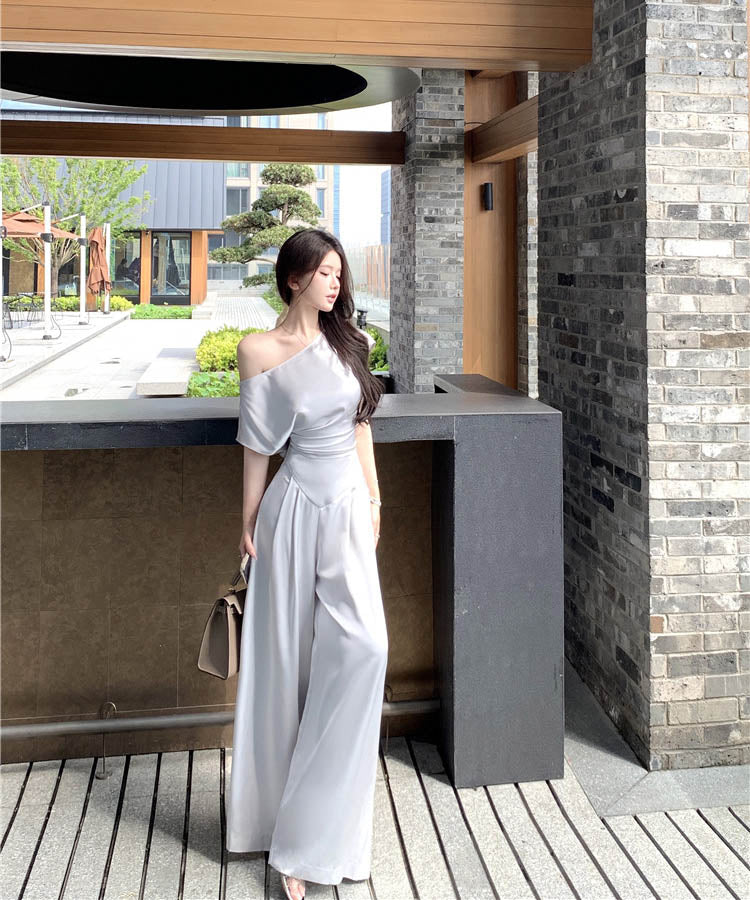 上下セットワイドパンツサテン高級感ワンショルダーセクシーエレガント通勤大人可愛い気質 WQ2-XKD-D529-6892-May10