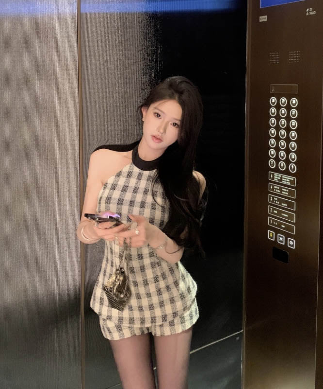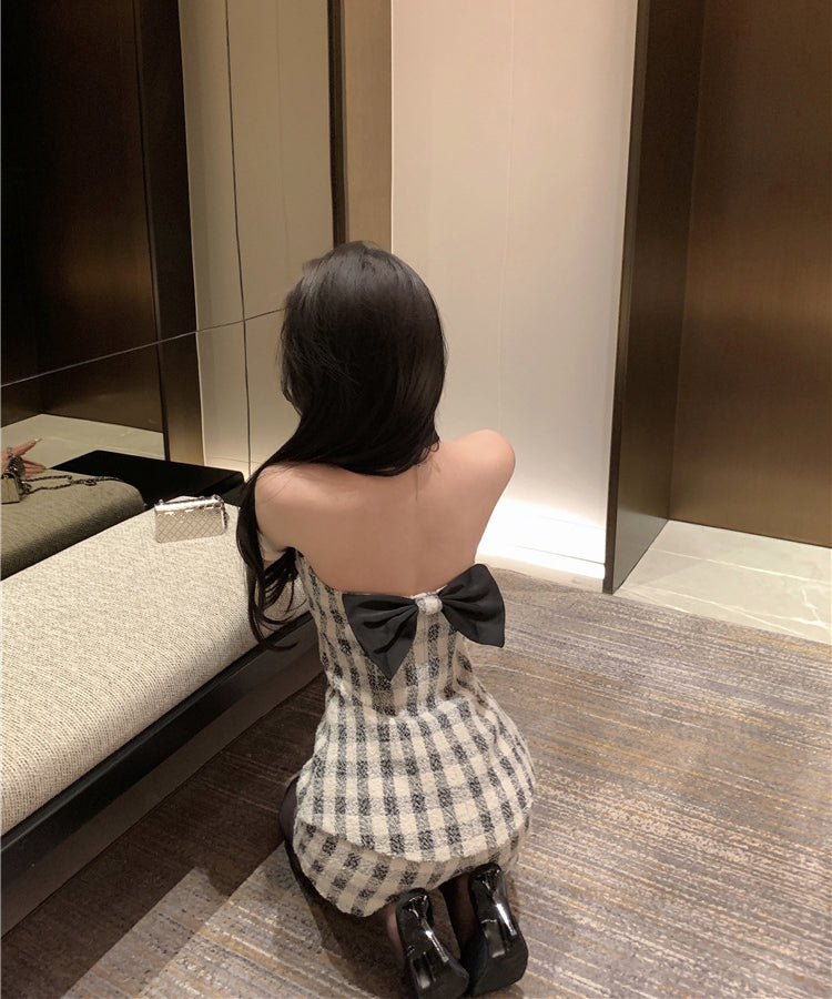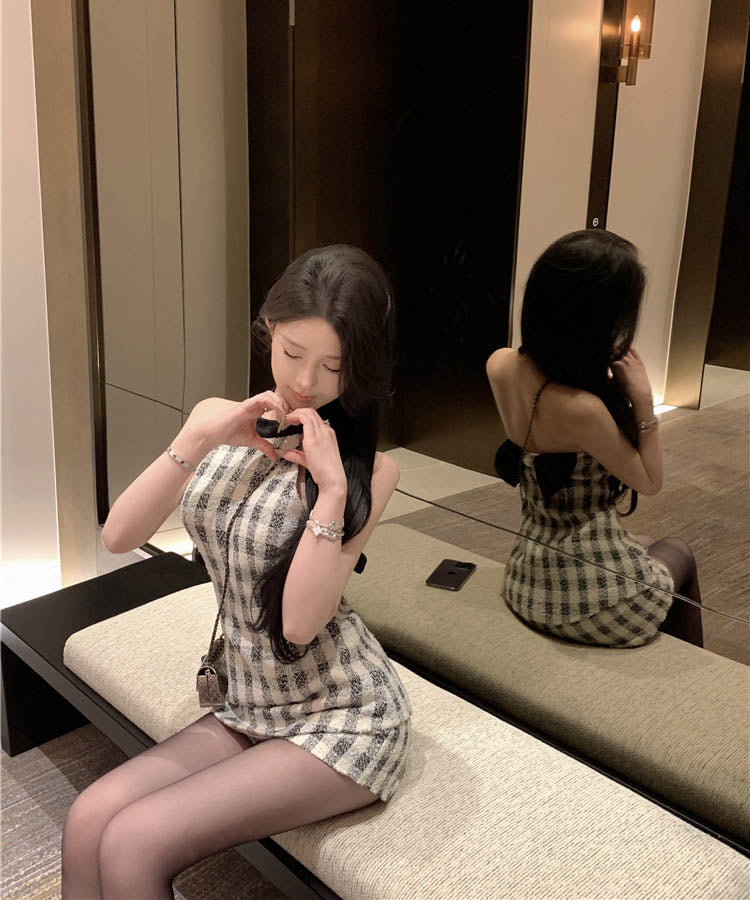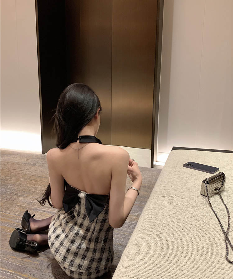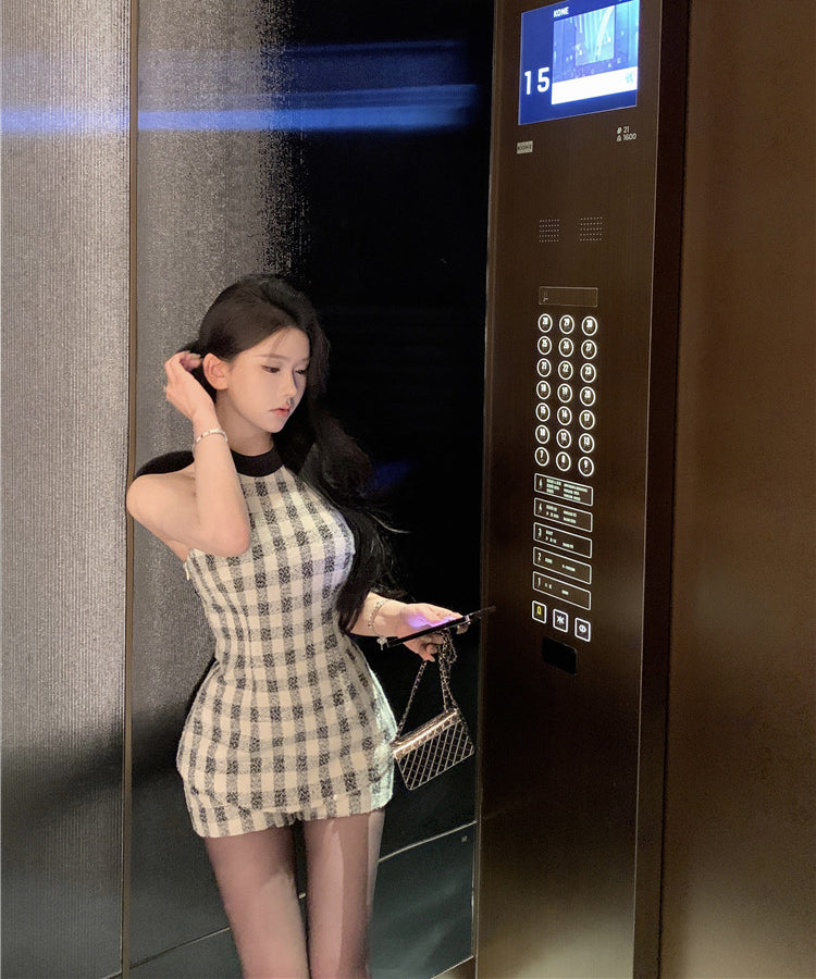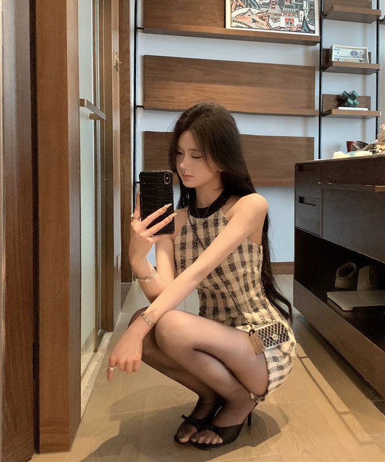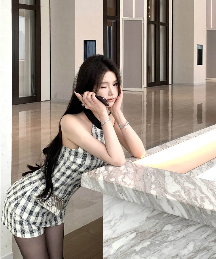 【上下セット】ミニドレス ツイードセット手作り チェック柄 ホルターネックバックレスカワセクシー セレブ風 通勤 エレガント WQ2-XKD-D529-6672-Feb20