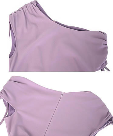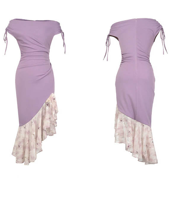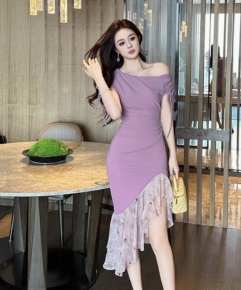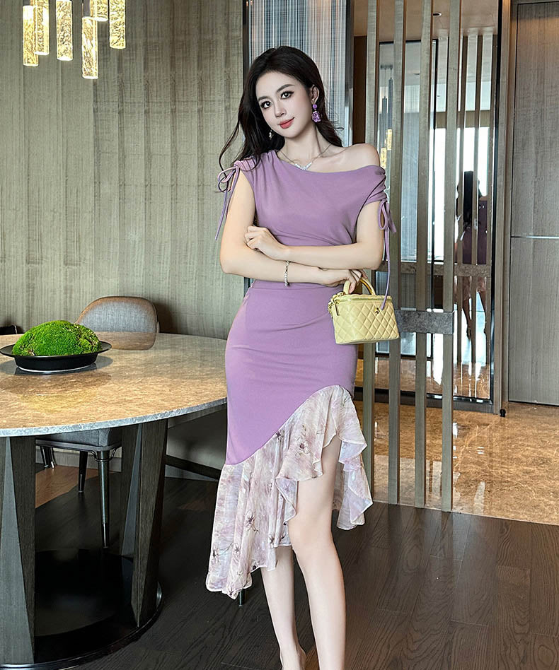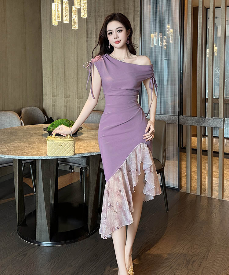 手作りドレス非対称オフショルダー花柄フリル非対称マーメイドドレス宴会パーティー着痩せ気質 WQ2-JY51329