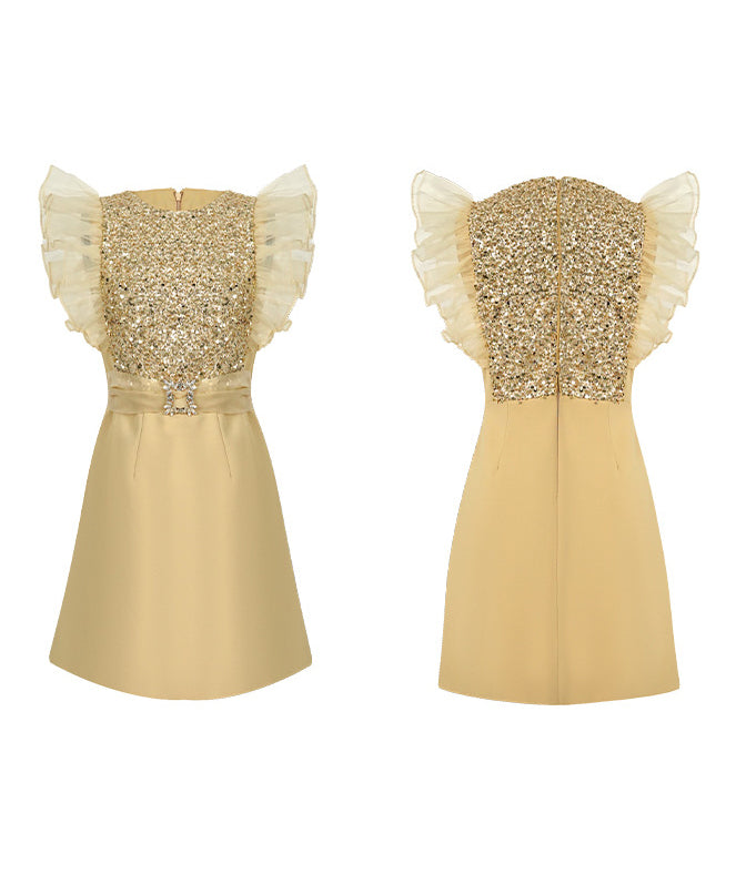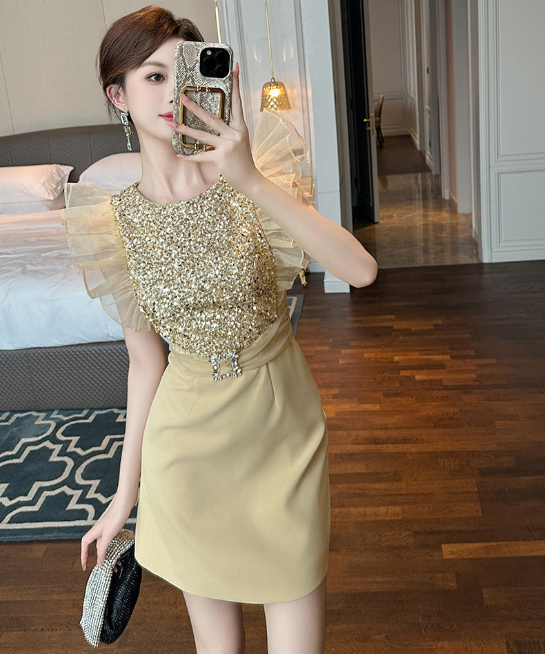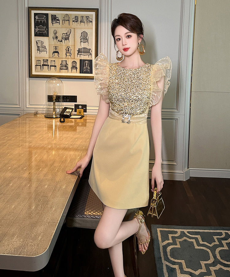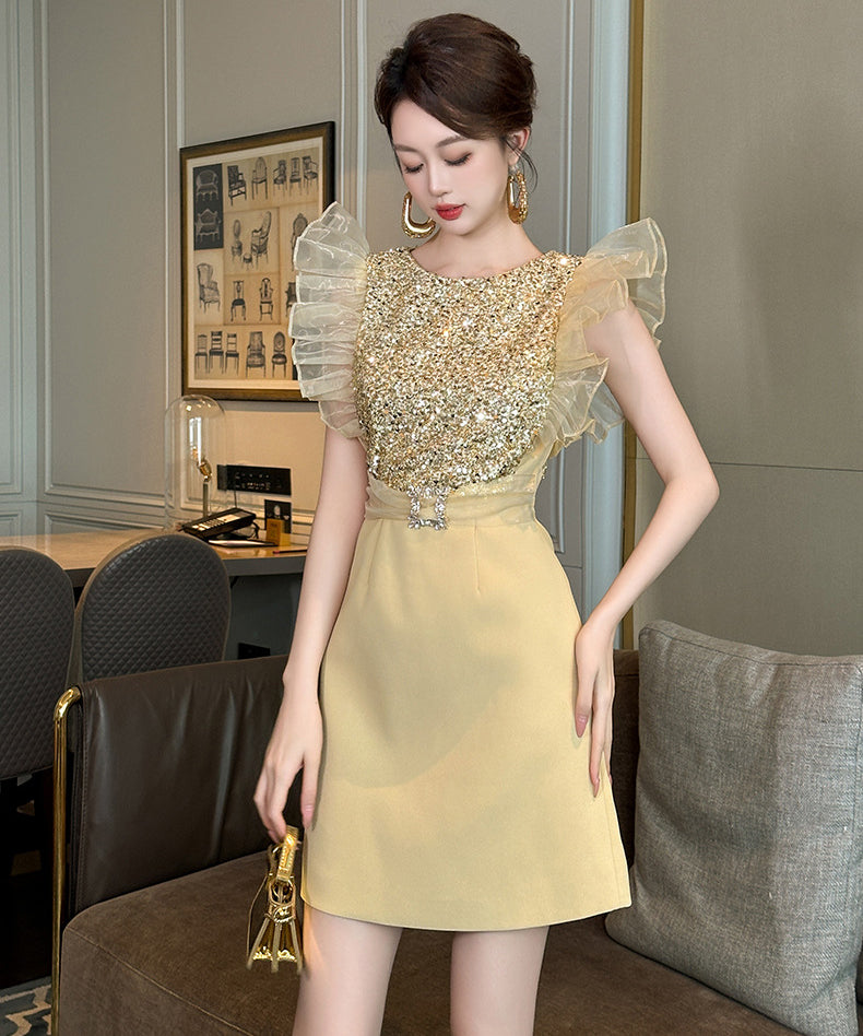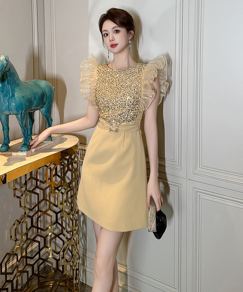 手作りドレス 膝丈ドレス キラキラ セレブ風 高級感 気質 フリル 小顔効果 XH2-JY50989