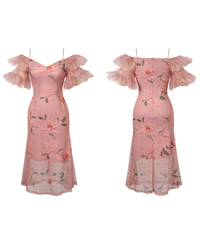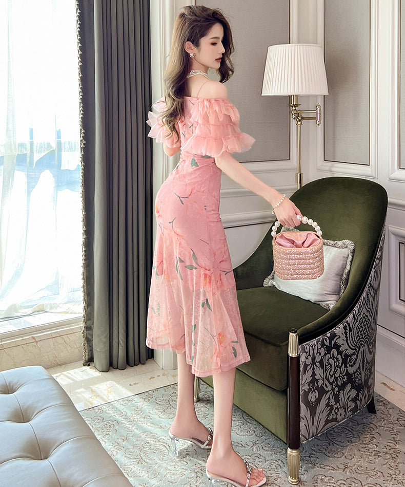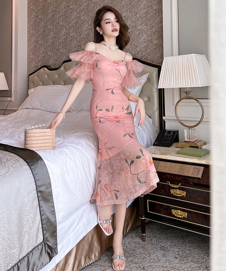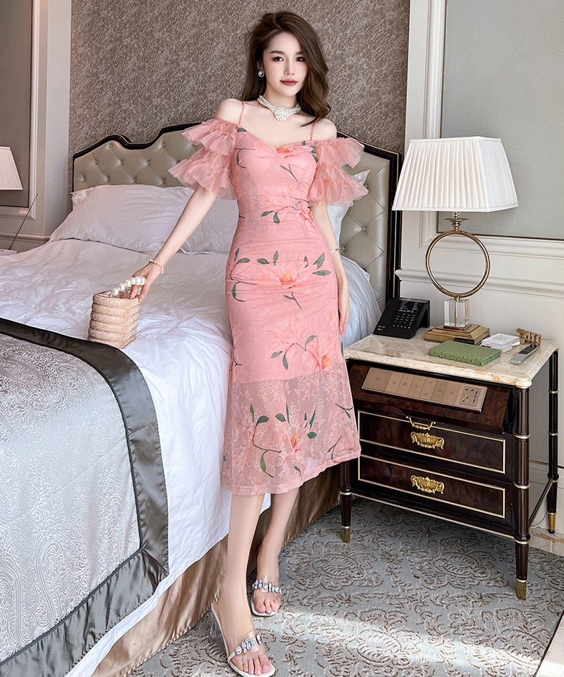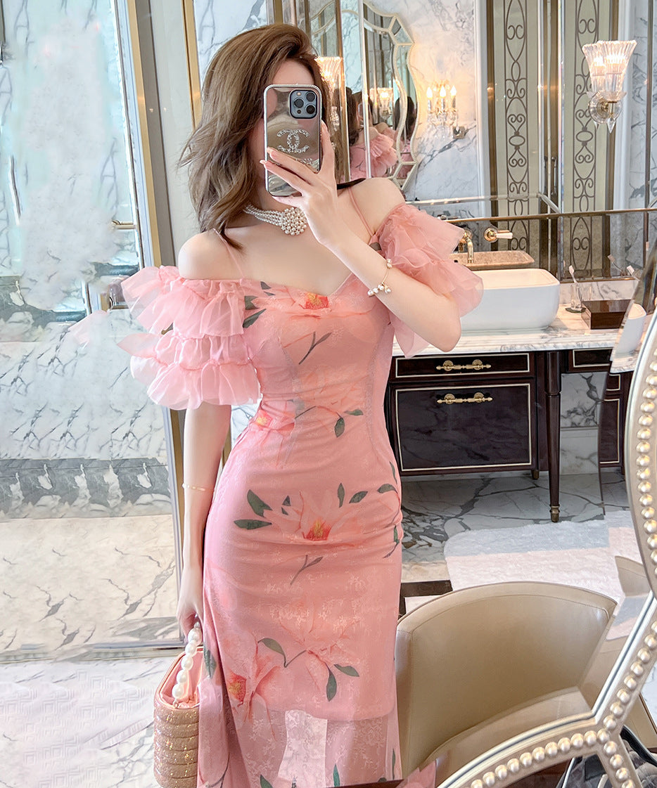 【手作り】ロングドレス ロマンティック風 花柄 パフスリーブ 小顔効果 フリル 大人可愛い XH2-JY10589