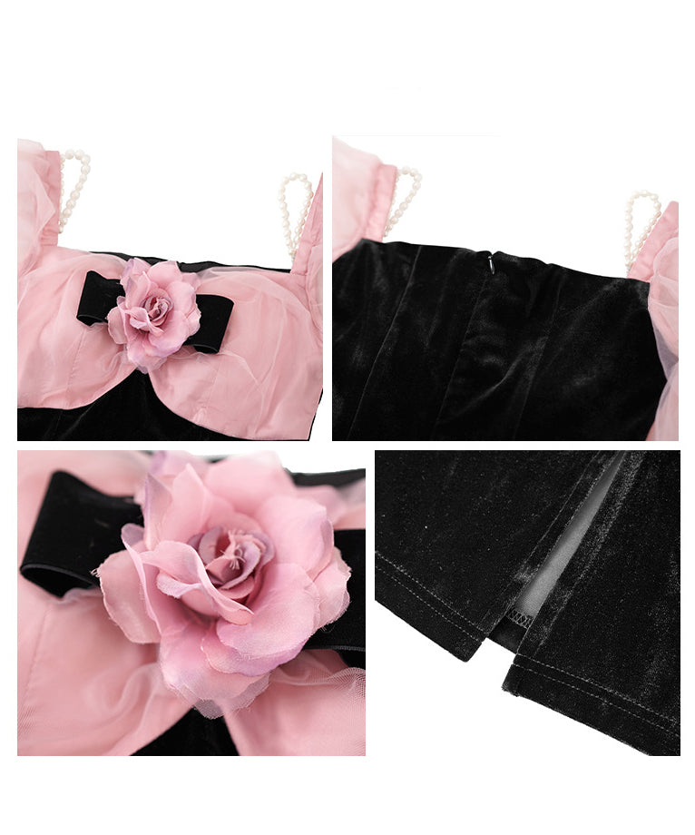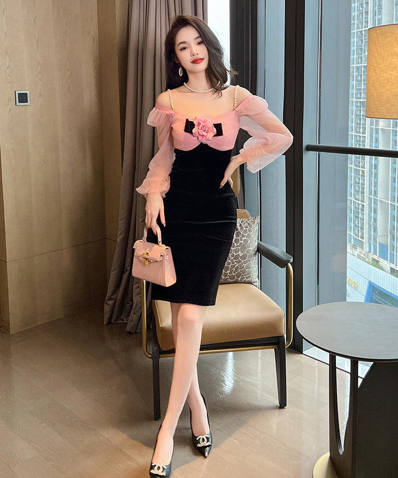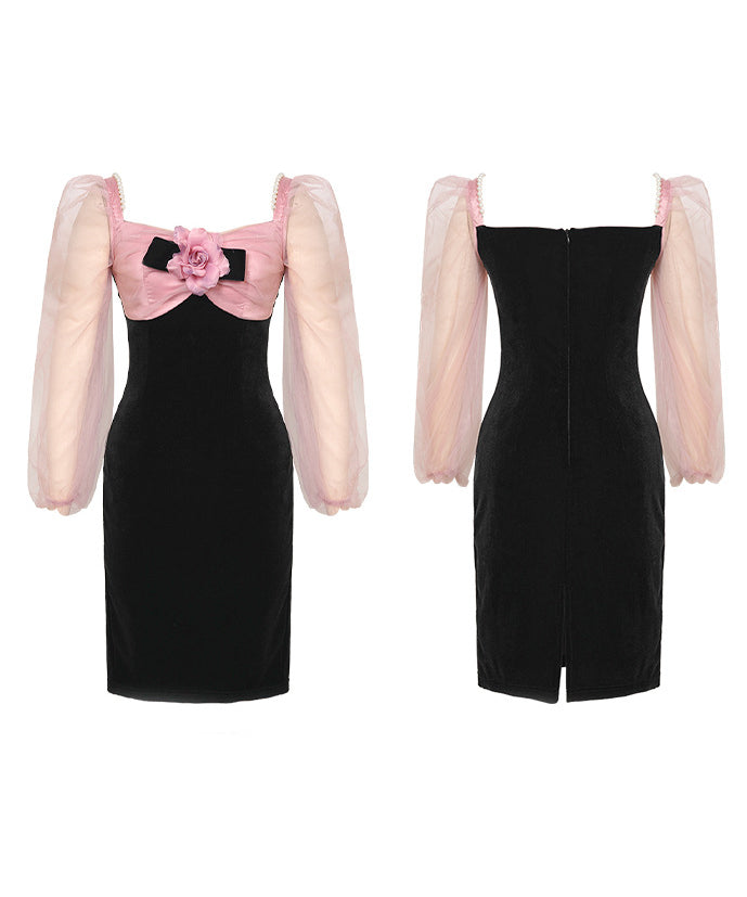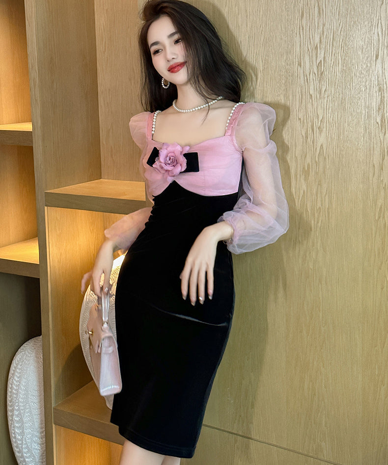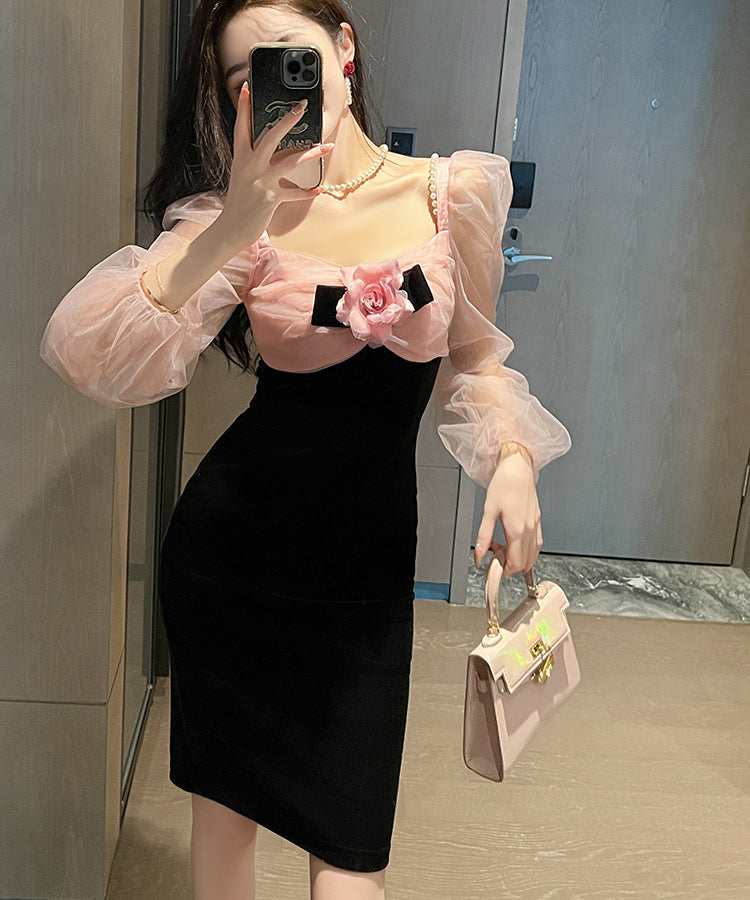 手作り 膝丈ドレス エレガント スクエアネック セレブ風 ローズ チュール 高級感 XH2-JY9707