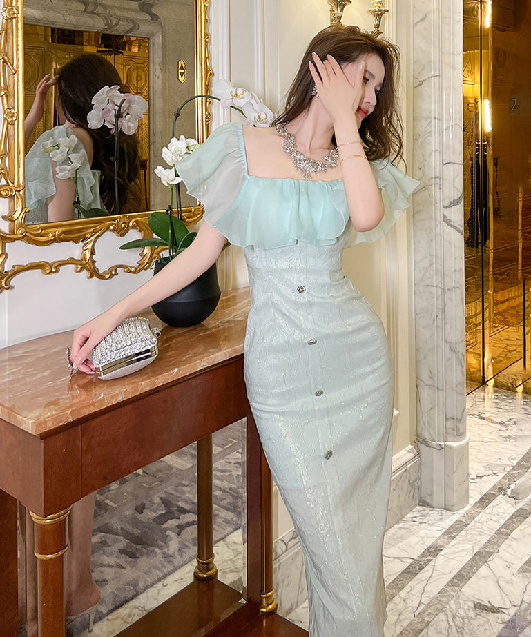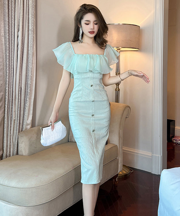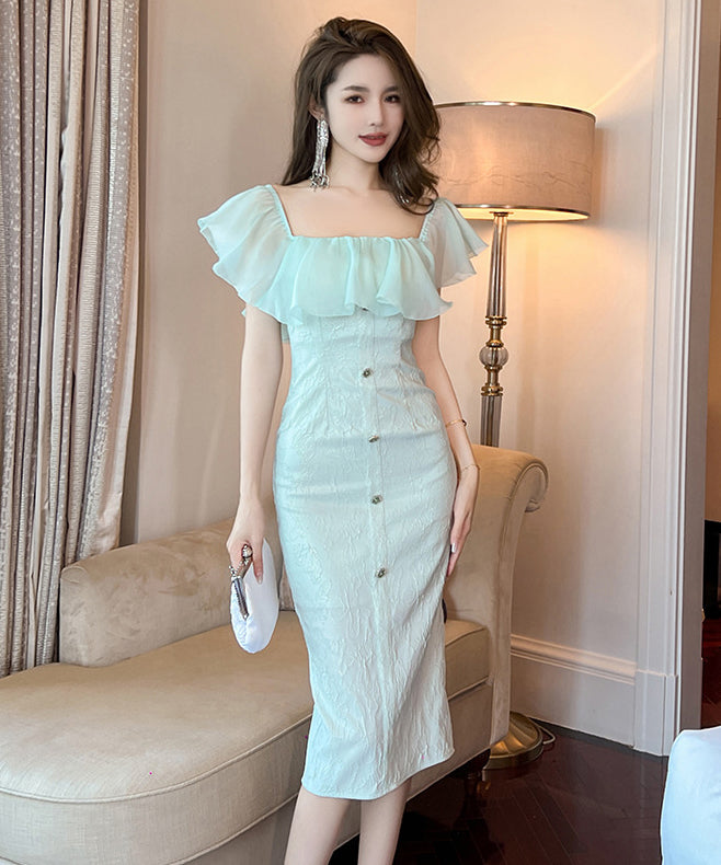 【手作り】膝丈ドレス フリル おしゃれ 小顔効果 スクエアネック エレガント XH2-JY20470