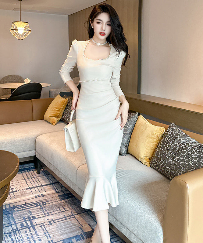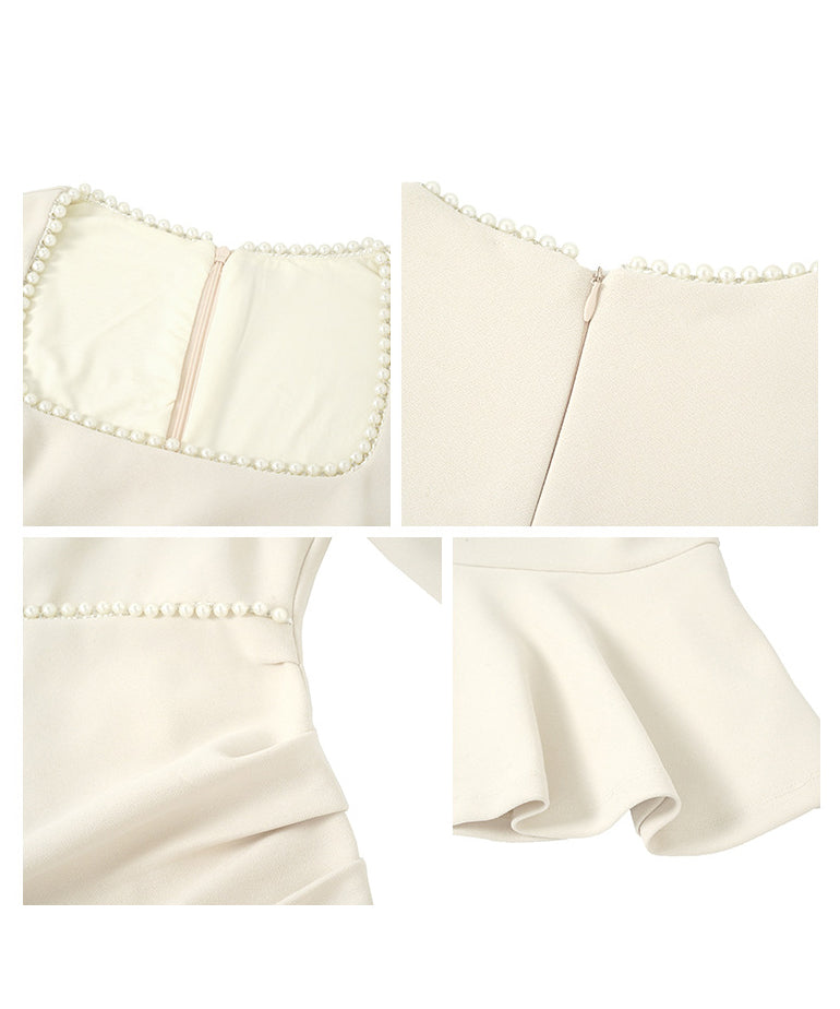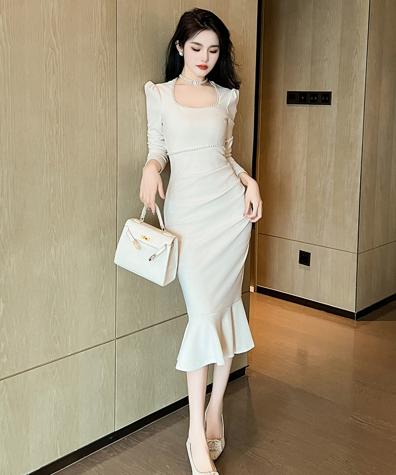手作り 膝丈ドレス マーメイド エレガント 気質 スクエアネック セレブ風 真珠 XH2-JY6017