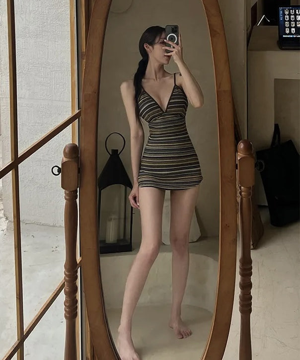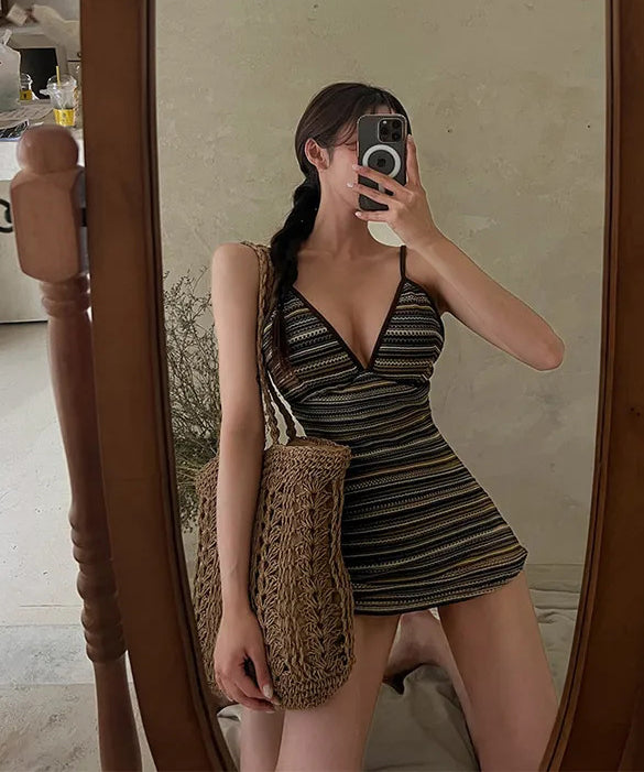 水着 ビキニ モノキニ おしゃれ 背露出 フリル セクシー 縞模様 YH7-KSD2907