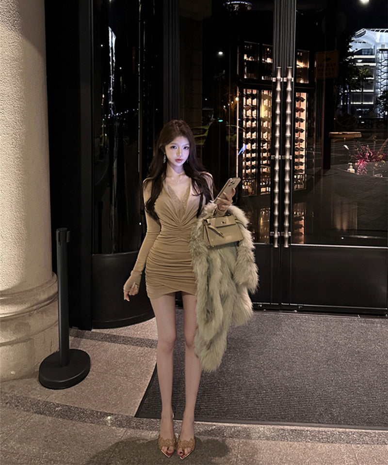 【秋冬新作】 ミニドレス キャバドレス セクシー Vネック レース切り替え シルエット レトロエレガント 上品 デート LW2-CD7-337-23210590