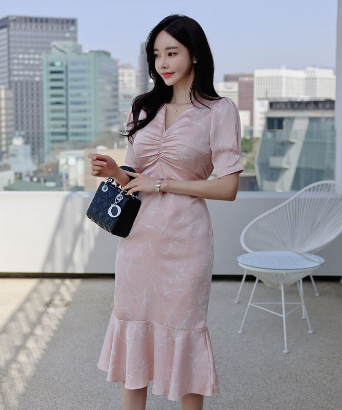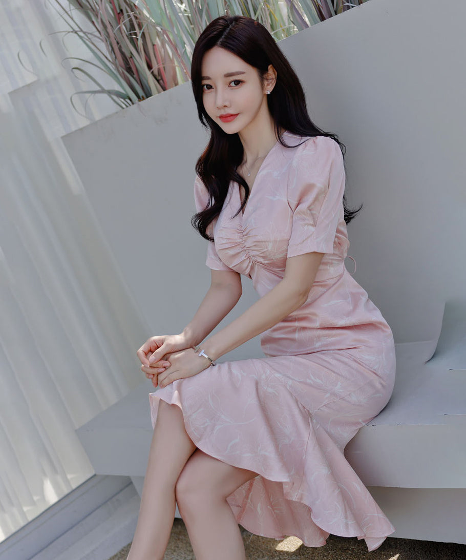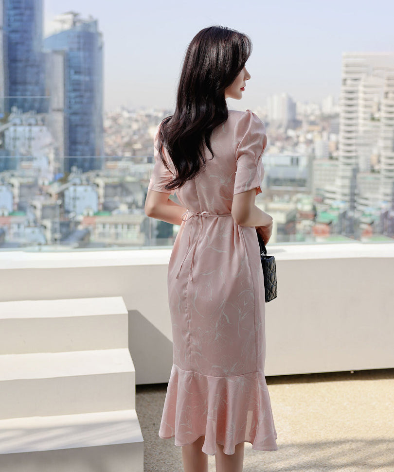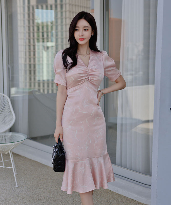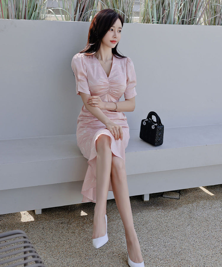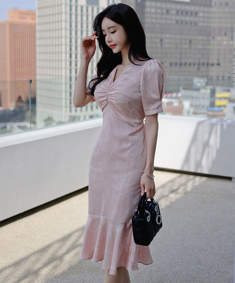 膝丈ドレス エレガント フリル パフスリーブ Vネック 大人可愛い セクシー XH2-ZED885753A71