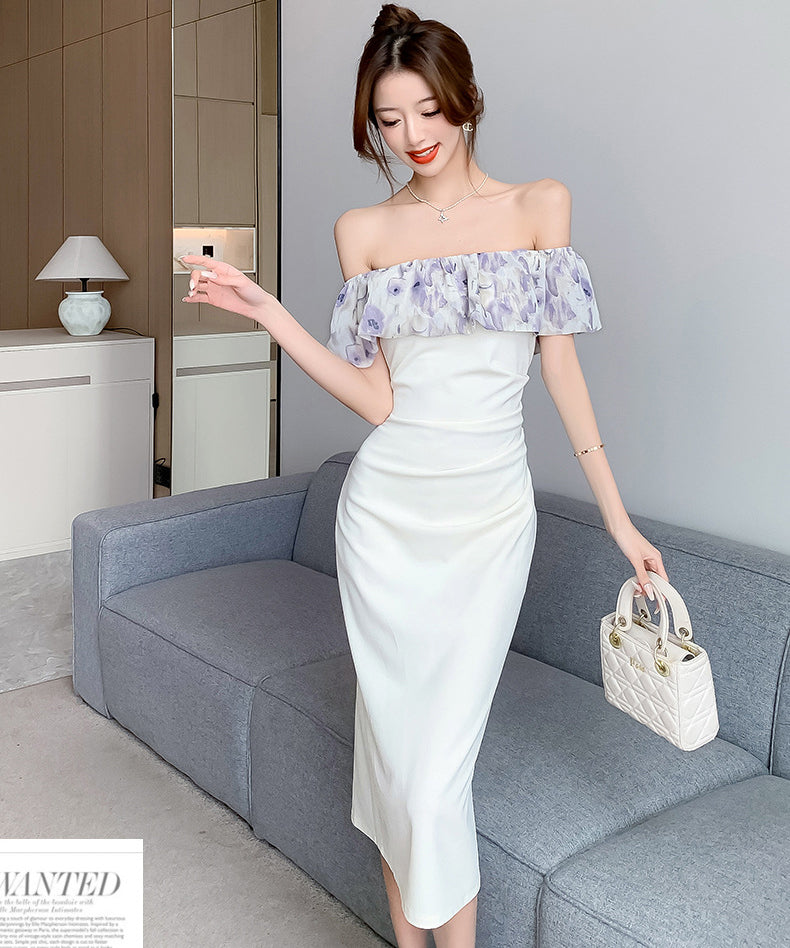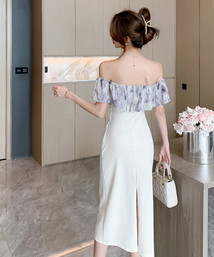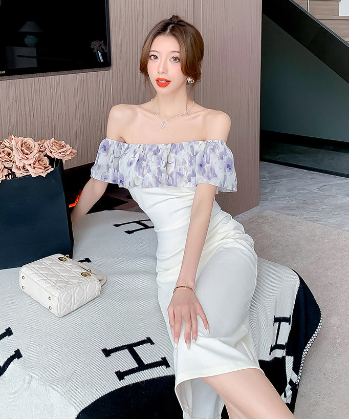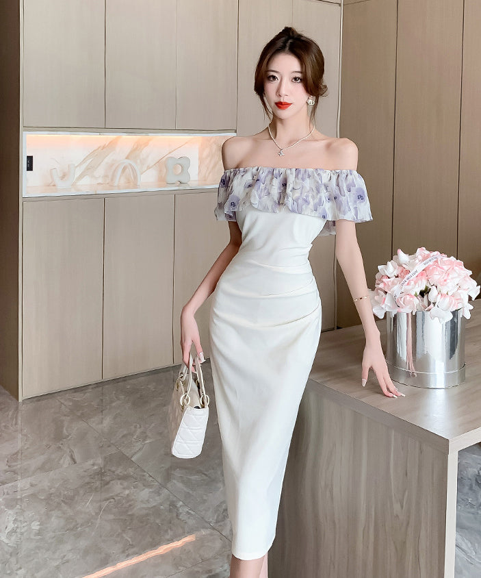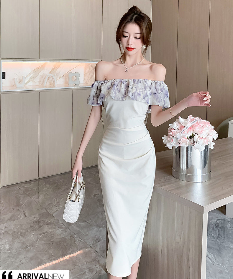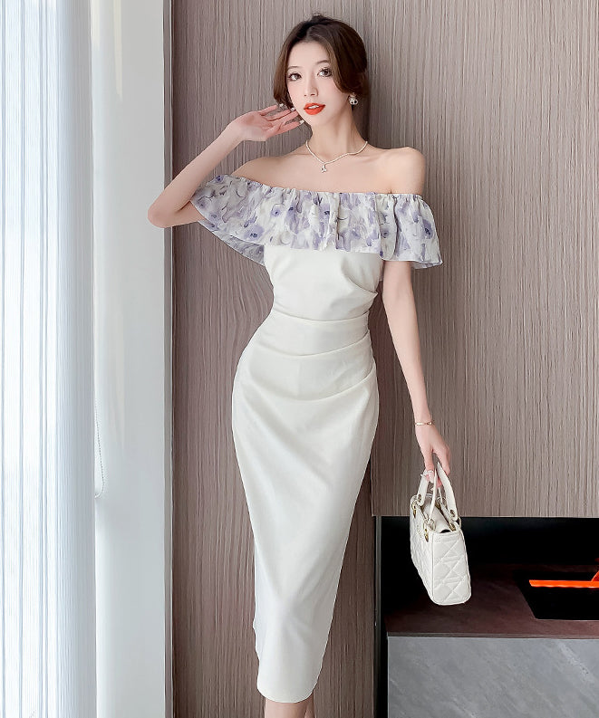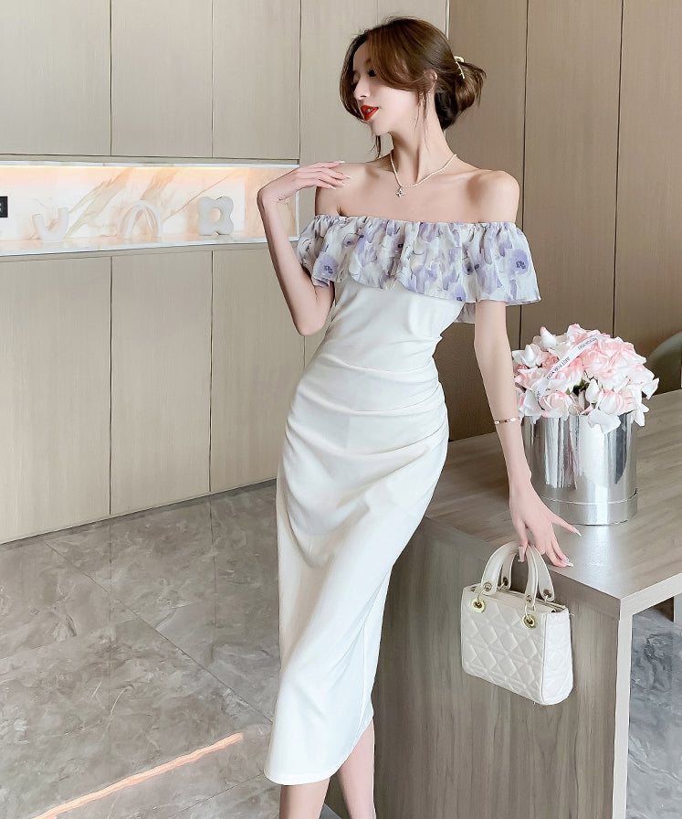 膝丈ドレス オフショルダー フリル 気質 エレガント 通勤 着痩せ おしゃれ XH2-DD4479