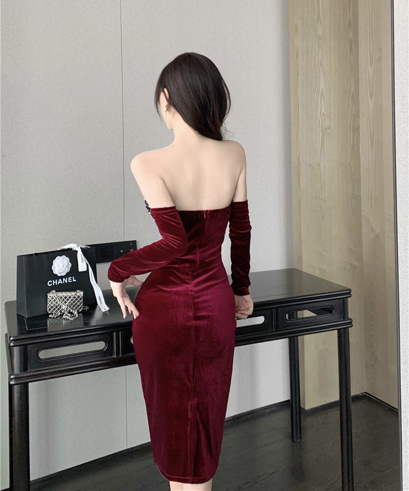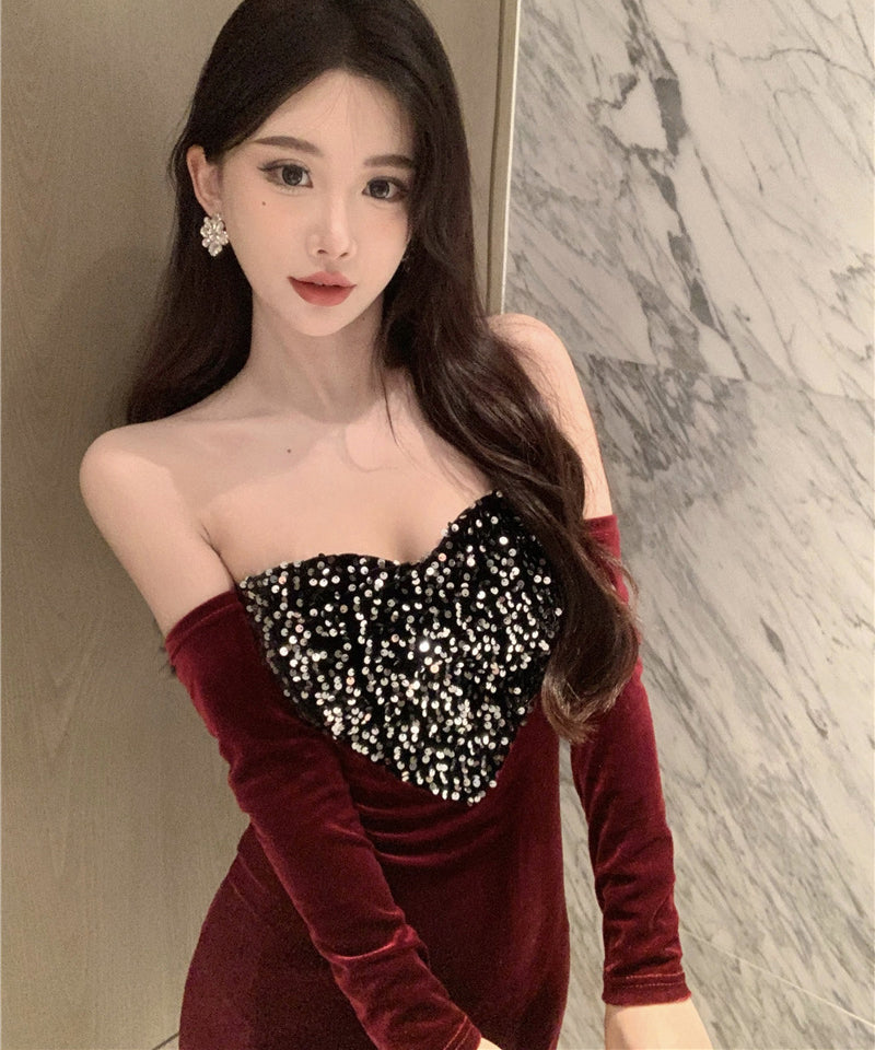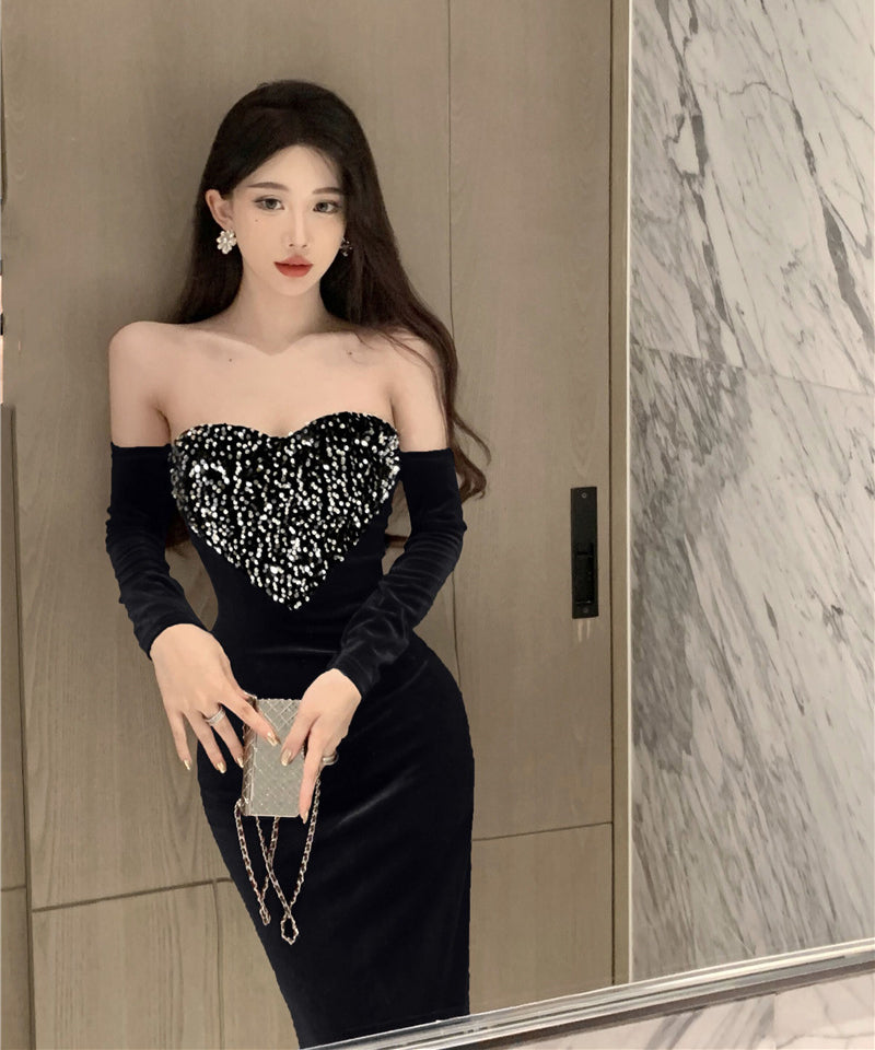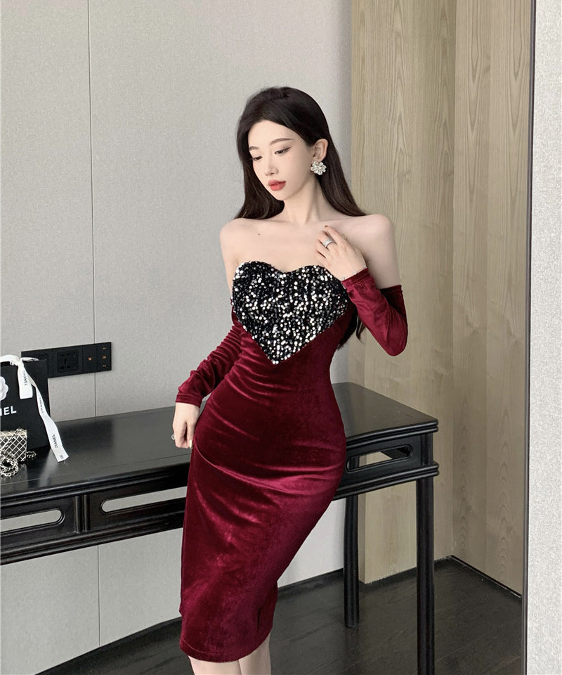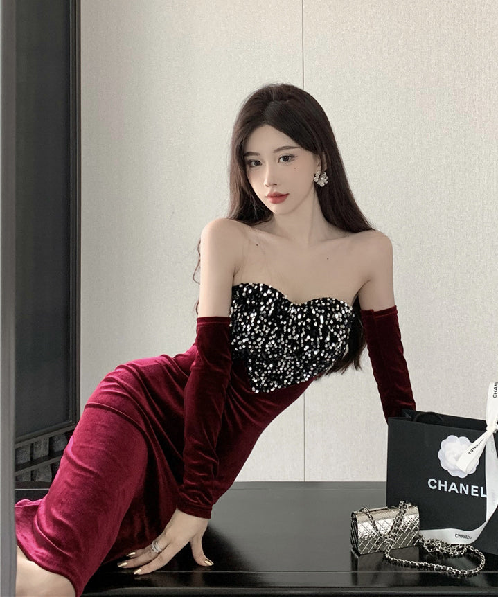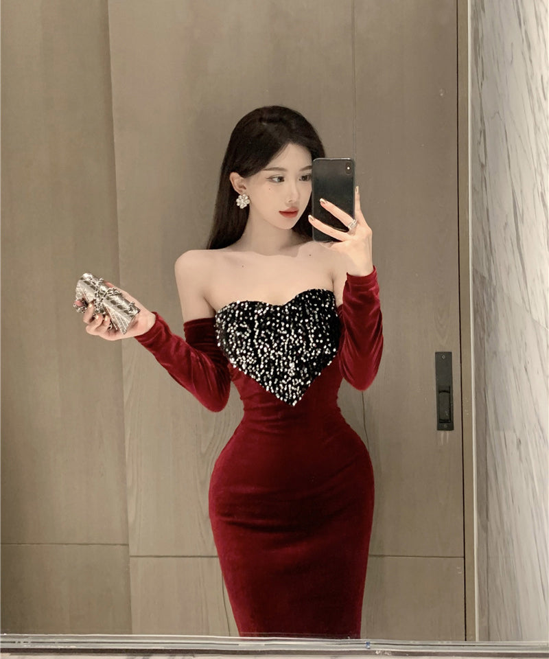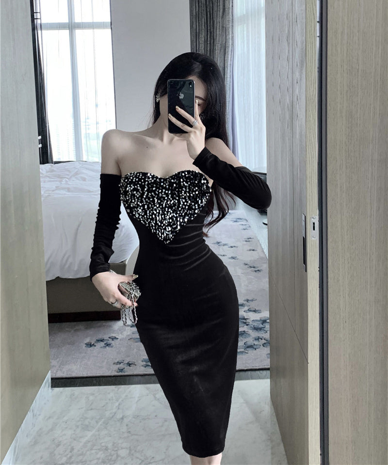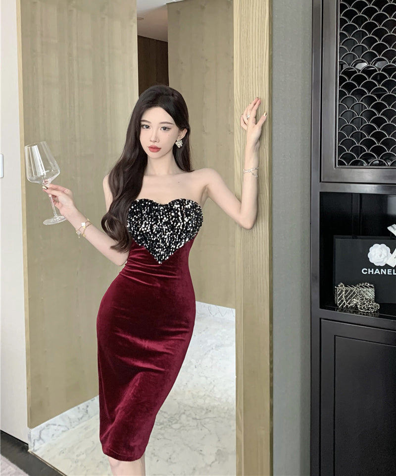 膝丈ドレス キャバドレス キラキラ 気質 ベアトップ セクシー 着瘦せ XH2-DD5333