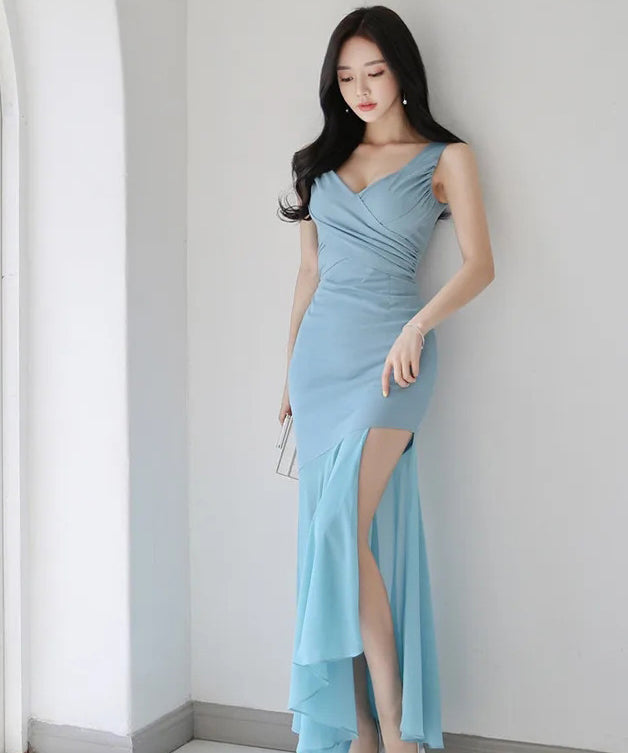 膝丈ドレス キャバドレス 気質 Vネック 谷間見せ セクシー 非対称 YH2-ZED882732BH506
