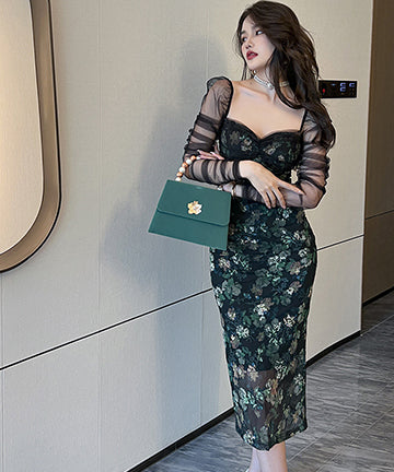 花柄 チュール ロングドレス セクシー 脚長効果 着瘦せ 高級感 披露宴 LT2-JY9467