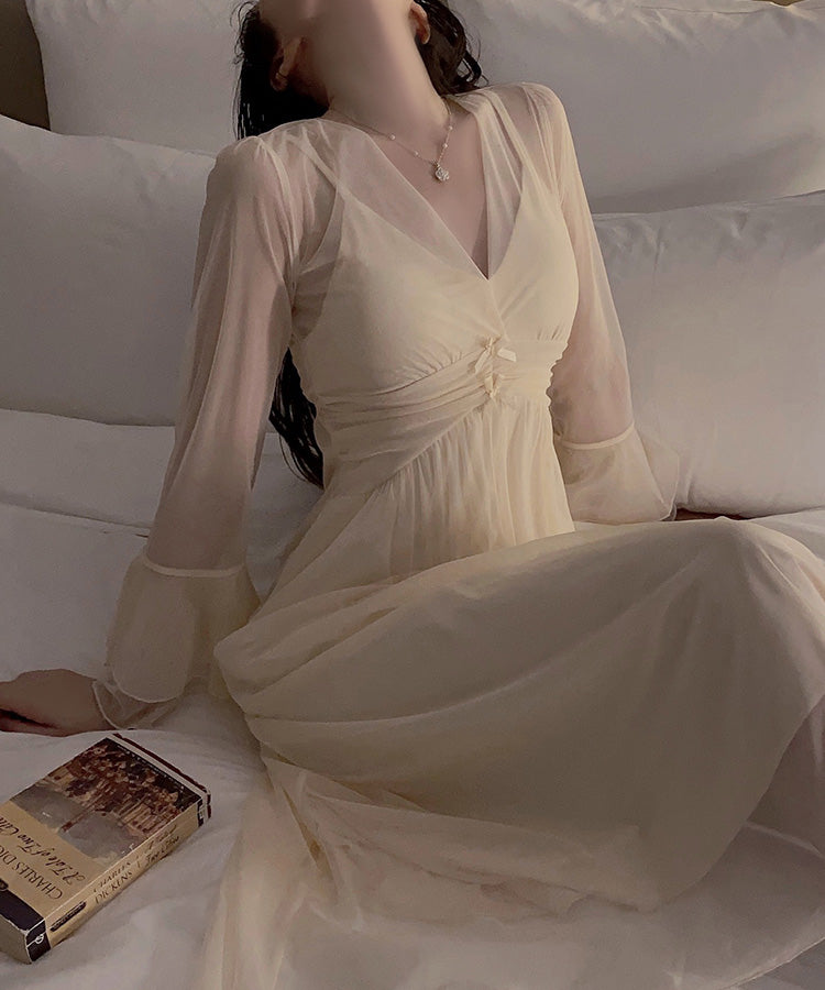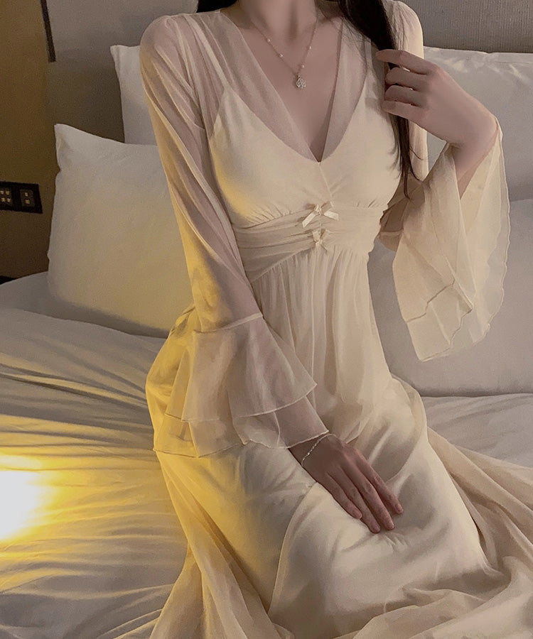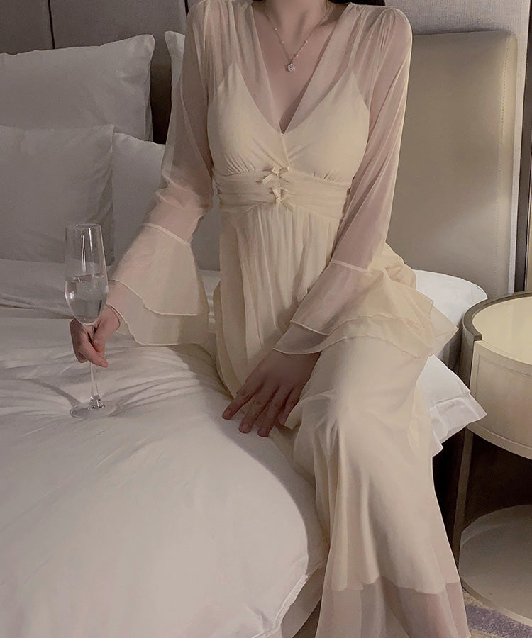 長袖 セクシー チュール パット付き 透け感 パジャマ ルームウェア かわいい YH8-GRP4212