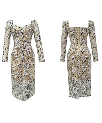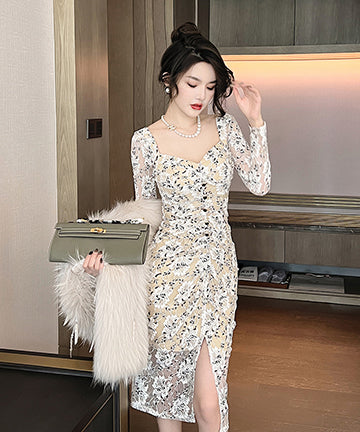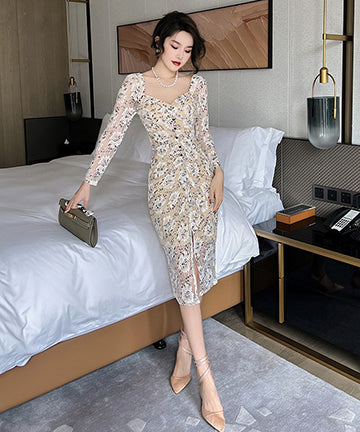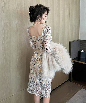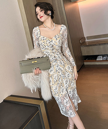 高級感 膝丈ドレス 宴会 結婚式 レース セレブ風 淑女 エレガント XH2-JY20171