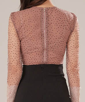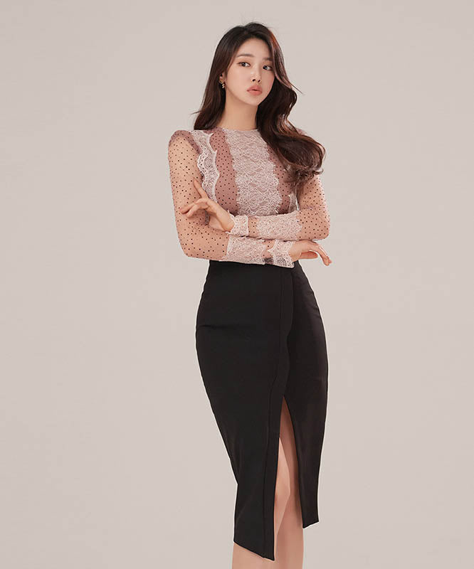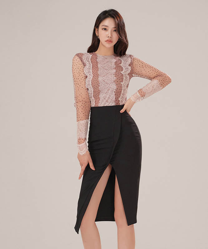 【2点セット】膝丈ドレスチュール水玉柄レース非対称セクシーエレガント気質同伴二次会宴会パーティー WQ2-ZED887252A71