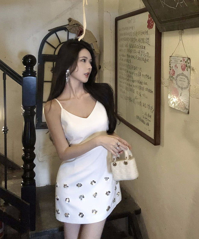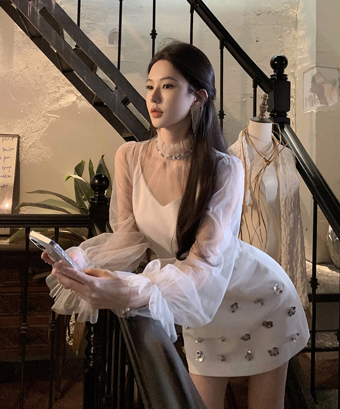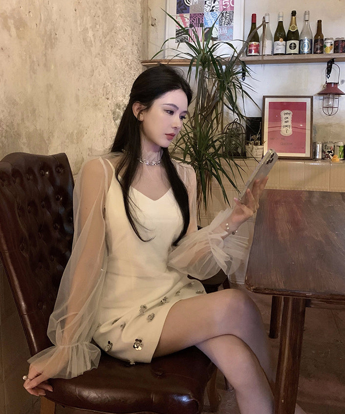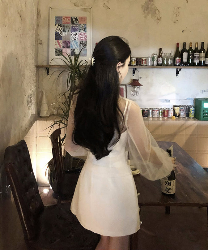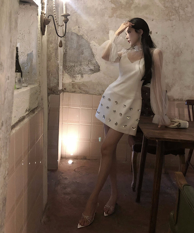 【2点セット】minidress キャバドレス キラキラ 高級感 セレブ風 パフスリーブ Vネック Sweet 通勤 XH2-DD7664