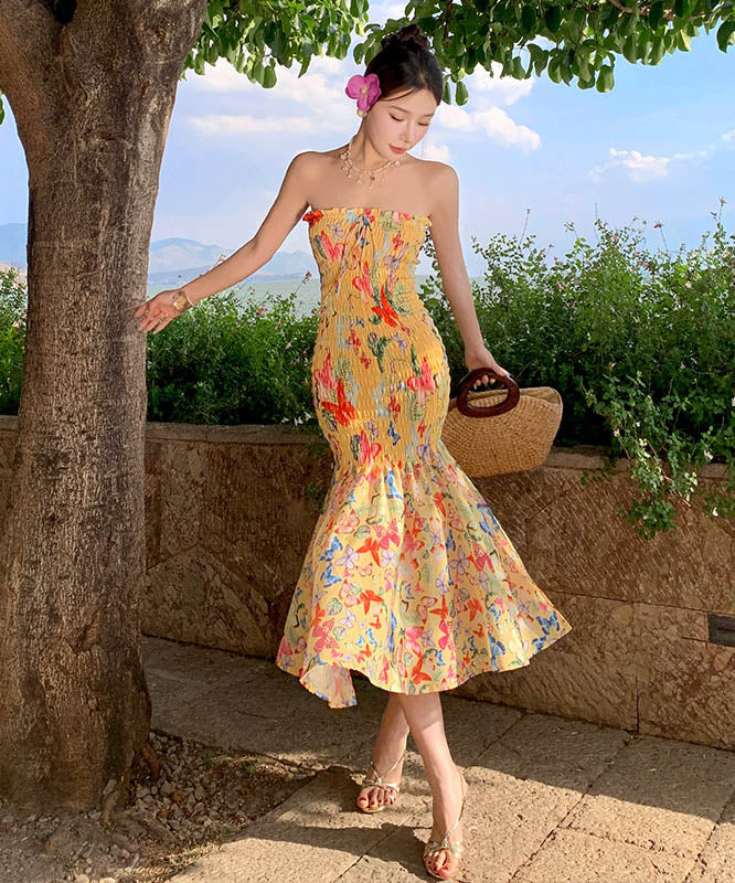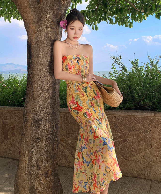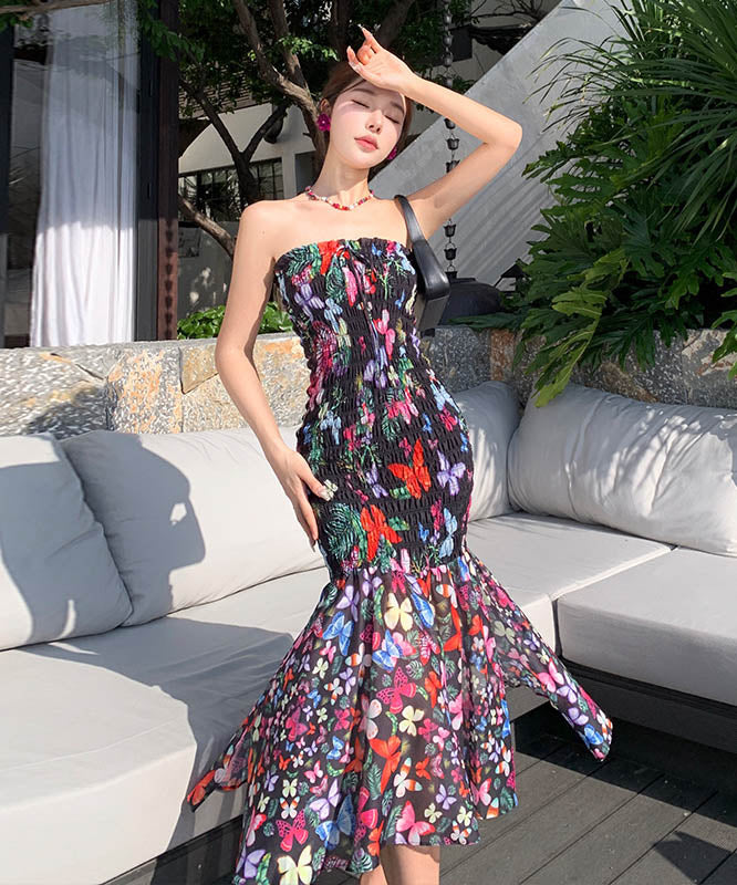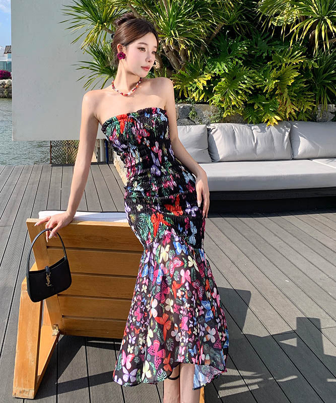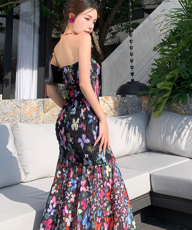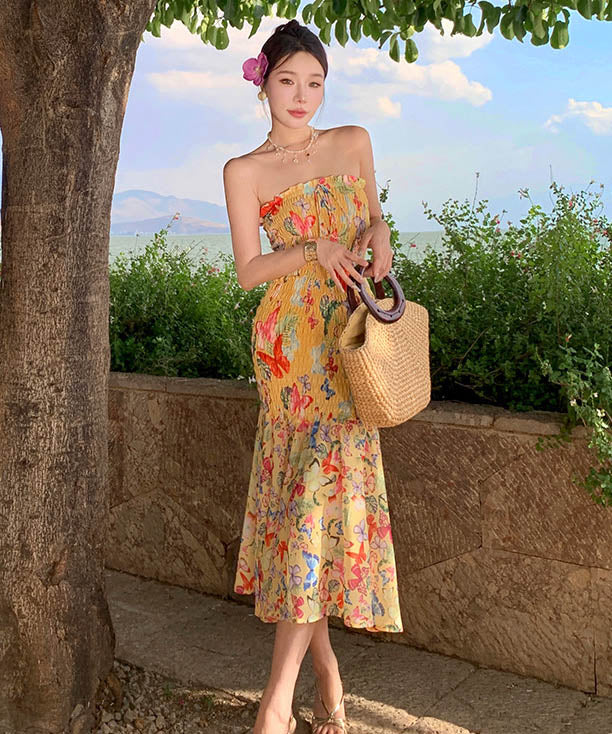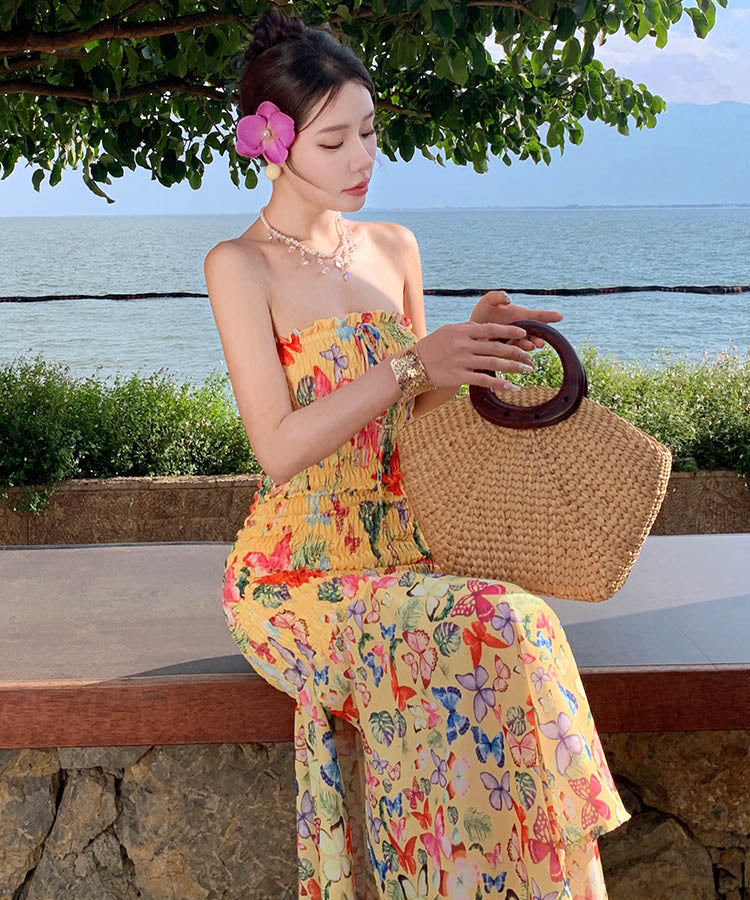 2色ロングドレスベアトップセクシーマーメイドドレス花柄着痩せ気質谷間見せ旅行フリル WQ2-XHY915721