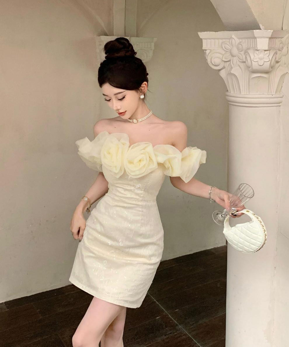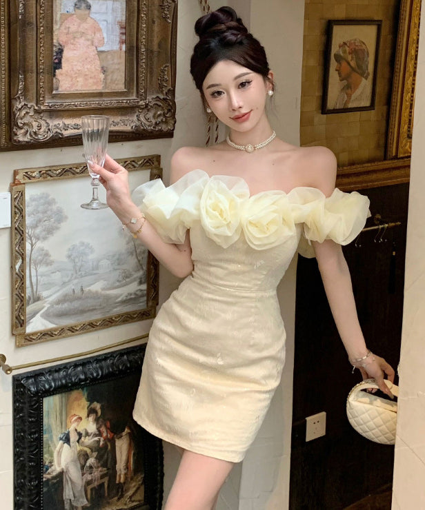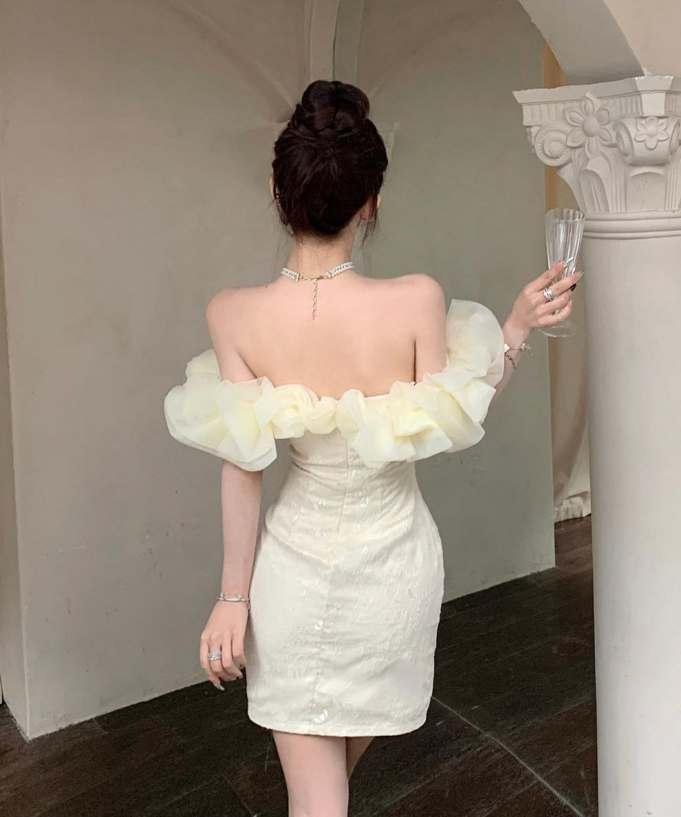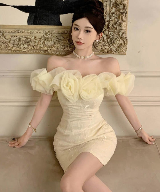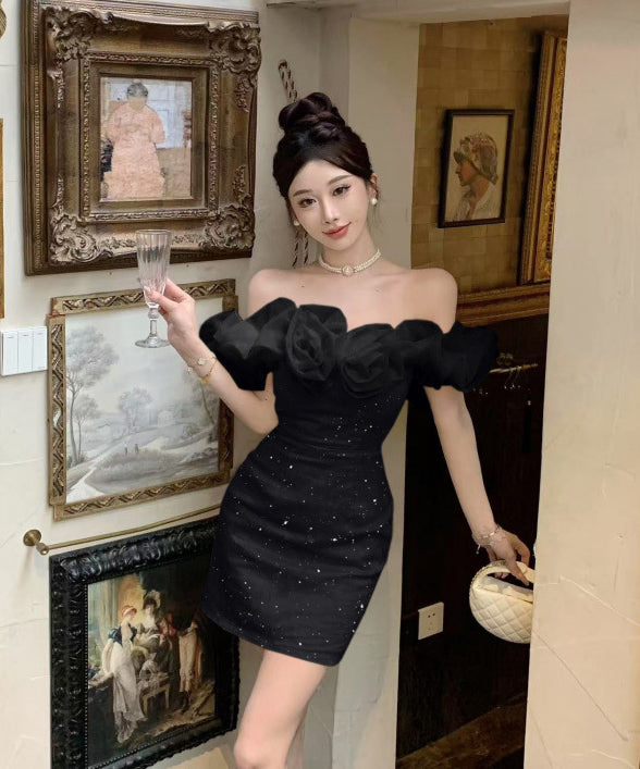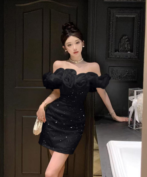 【2色】ミニドレスオフショルダーキャバドレスチュールフラワーキラキラ宴会パーティーナイトクラブ WQ2-ZED888619DXH238A