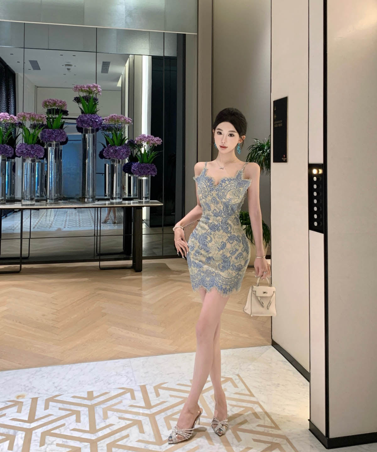 【2色】ミニドレスキャバドレス刺繍セクシーレースキャミワンピ谷間見せナイトクラブVネック小顔 WQ2-DD4835