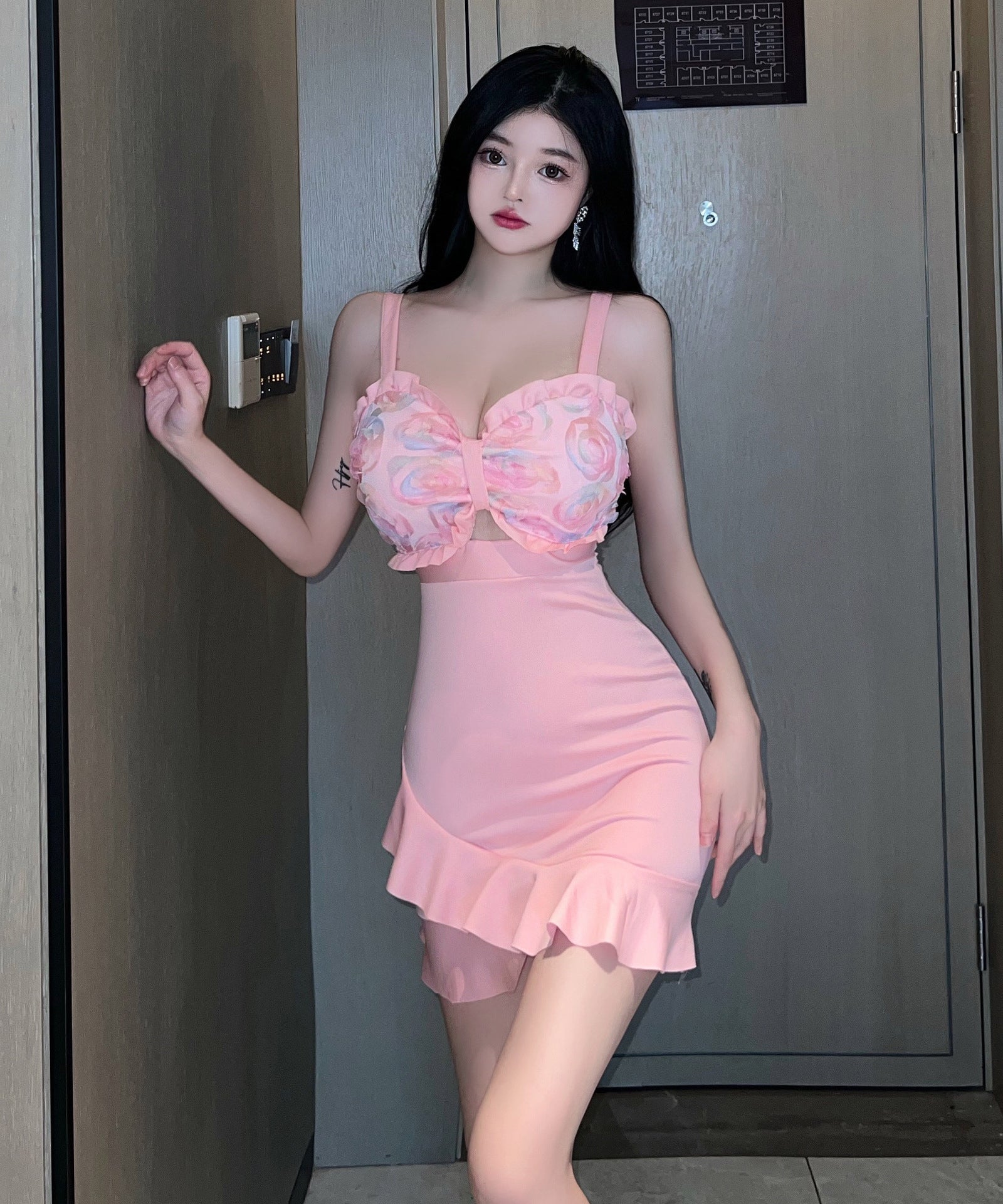 【2色】ミニドレス キャバドレス カワセクシー 谷間見せ 花柄 フリル 非対称 XH2-DD4587