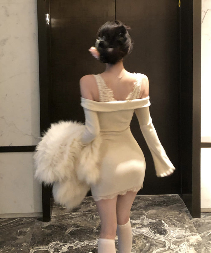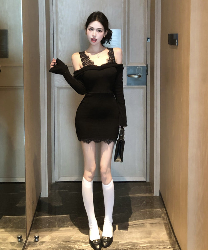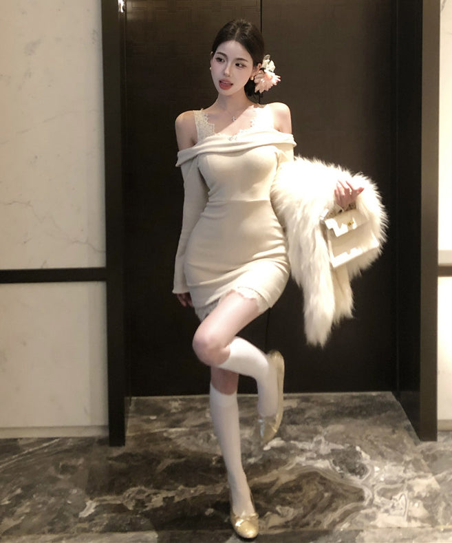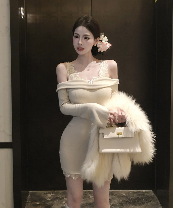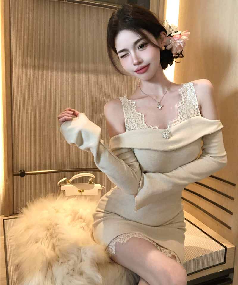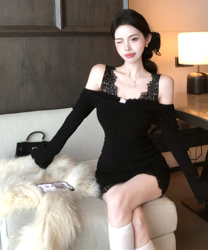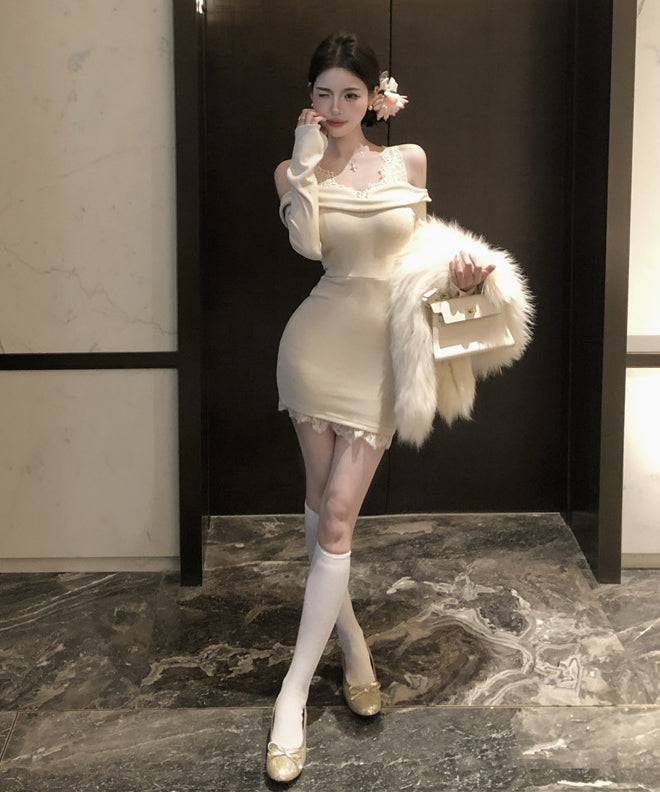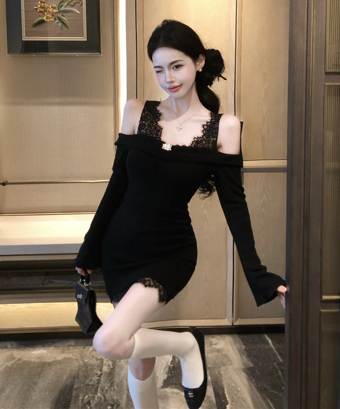 【2色】ミニドレス キャバドレス セクシー フレンチエレガント オフショルダー レース切替 ニット スリムフィット 秋冬 デート お出かけ JC2-XKDD426-7932-Sep21