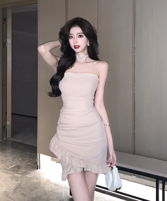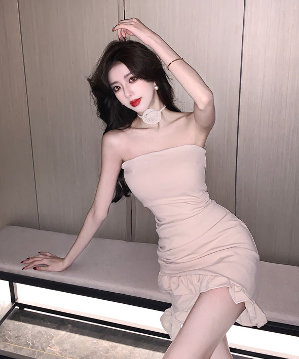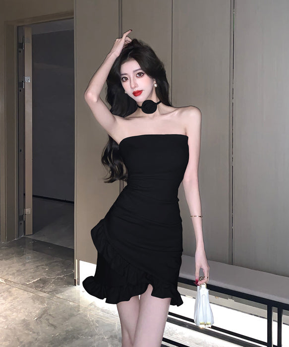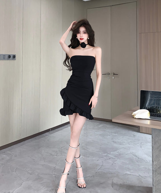 【2色】ミニドレス ベアトップ 非対称 セクシー フラワー フリル XH2-ZED886090GT513