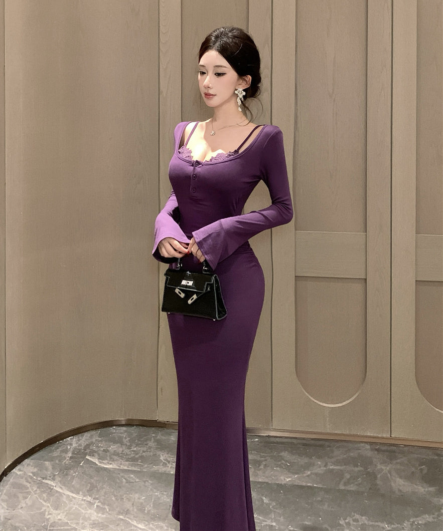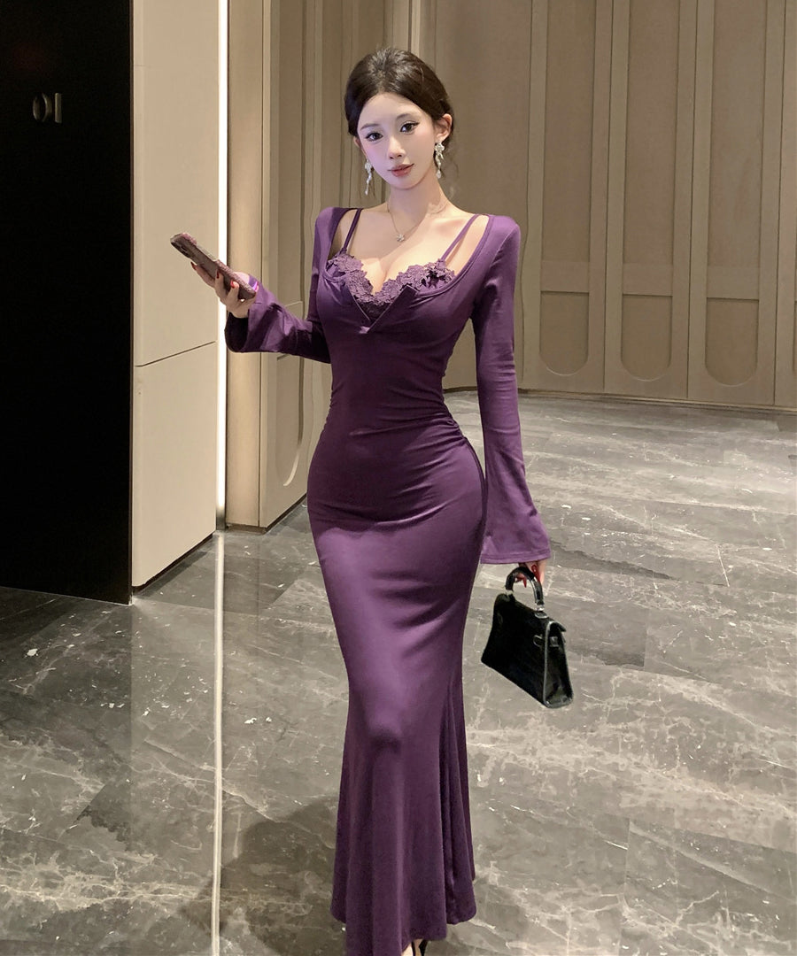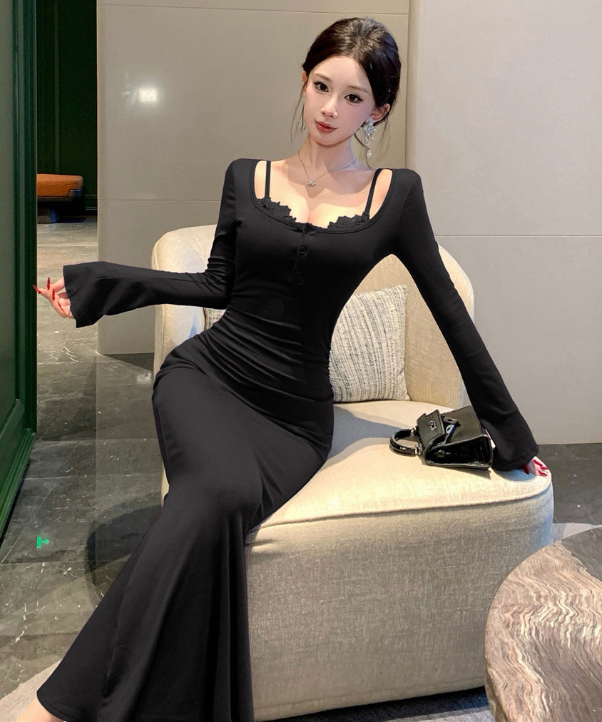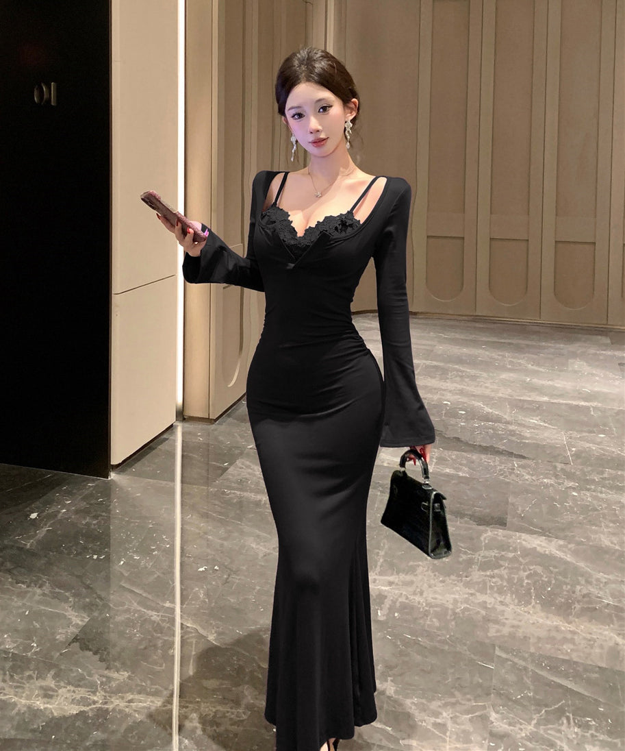 【2色】ロングドレス キャバドレス セクシー フェイクレイヤード レーストリム キャミソール 谷間魅せ 上品 タイト マーメイドワンピ 指名 JC2-DD6075