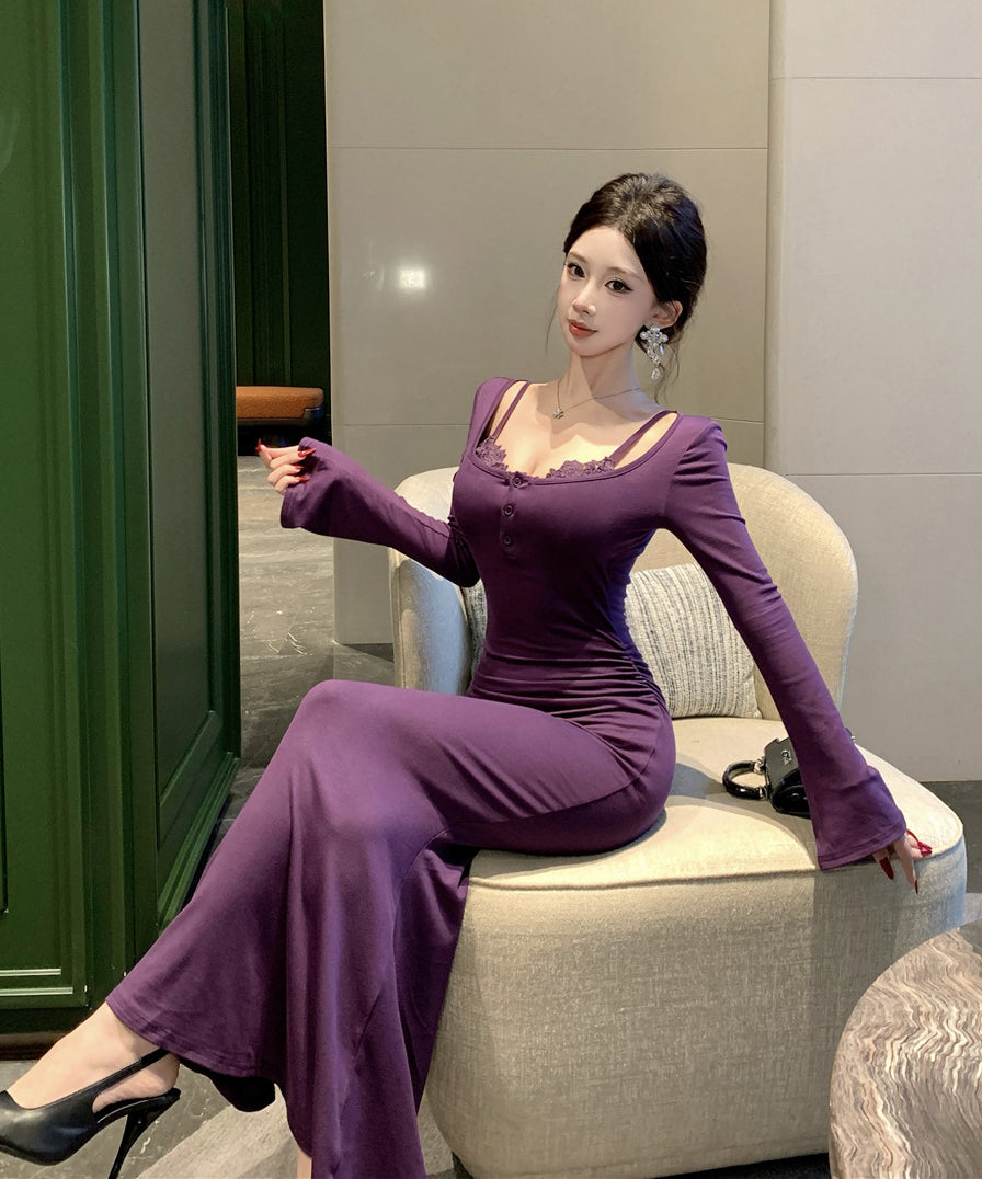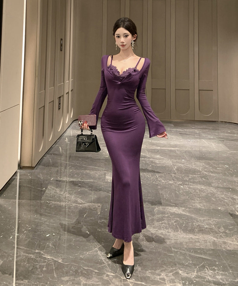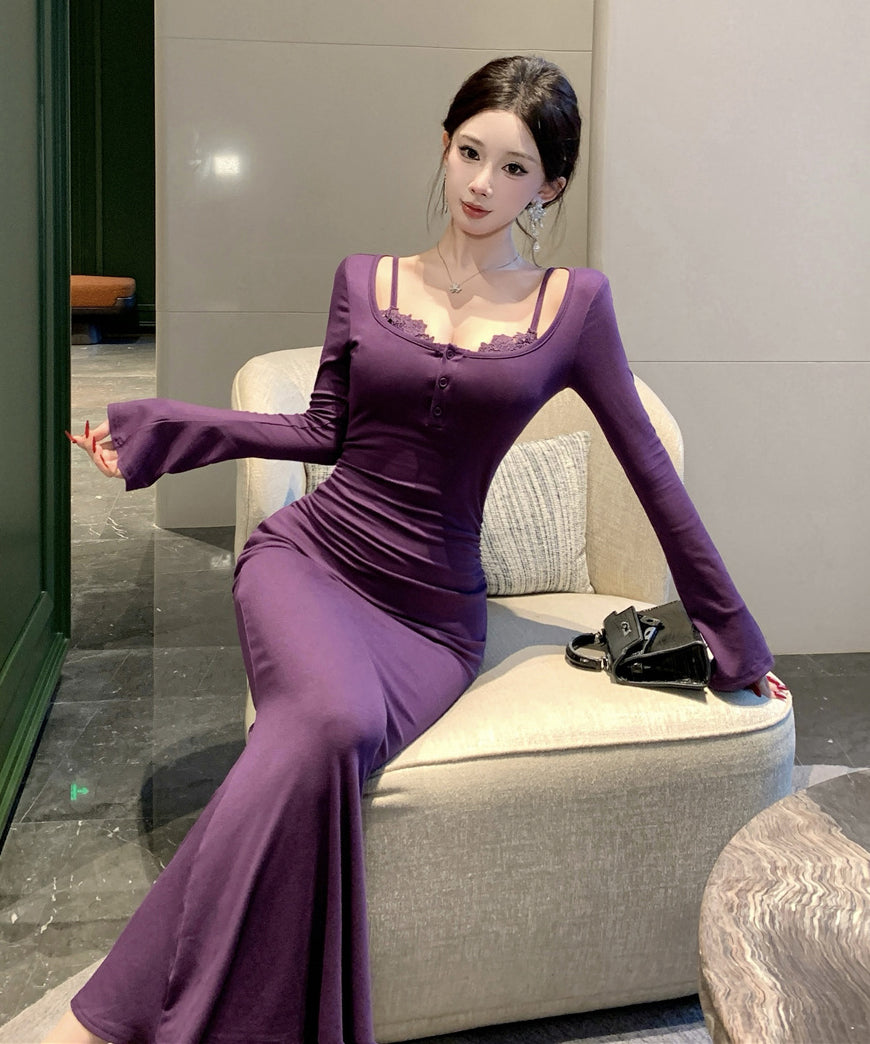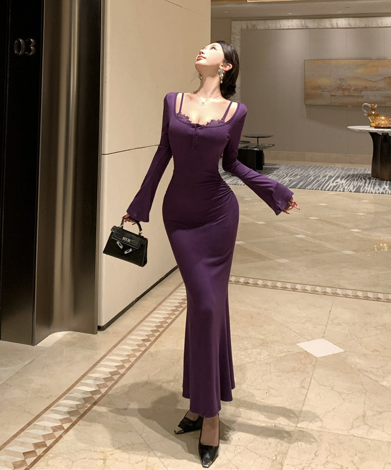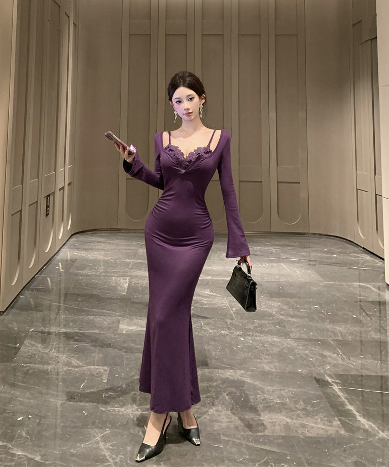 【2色】ロングドレス キャバドレス セクシー フェイクレイヤード レーストリム キャミソール 谷間魅せ 上品 タイト マーメイドワンピ 指名 JC2-DD6075