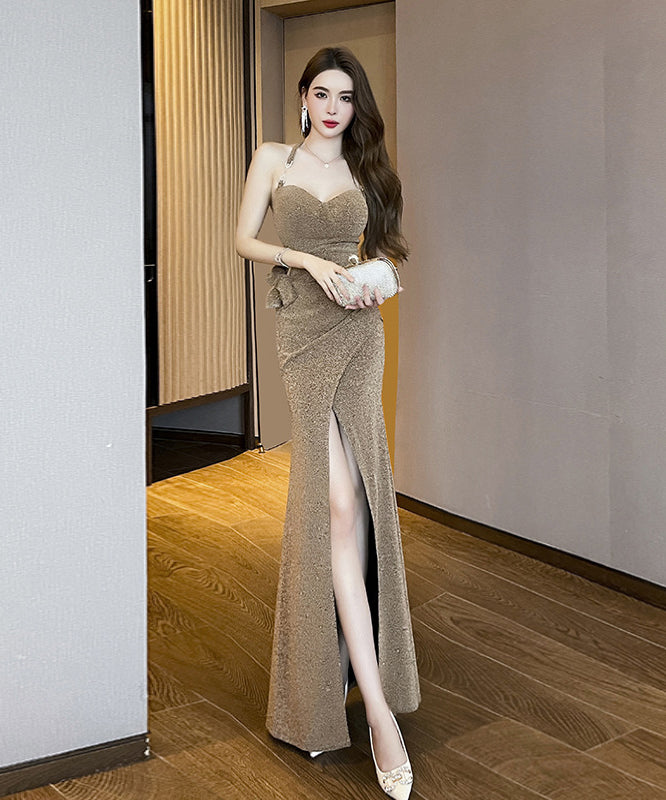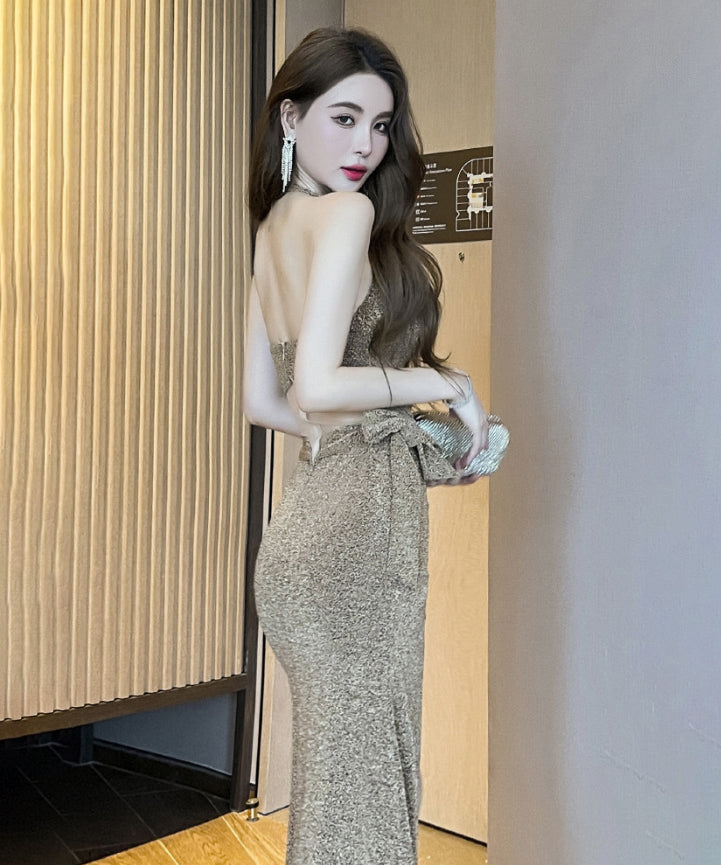 【2色】ロングドレス ホルターネック 谷間見せ セクシー 宴会 ナイトドレス 背露出 XH2-YM9171
