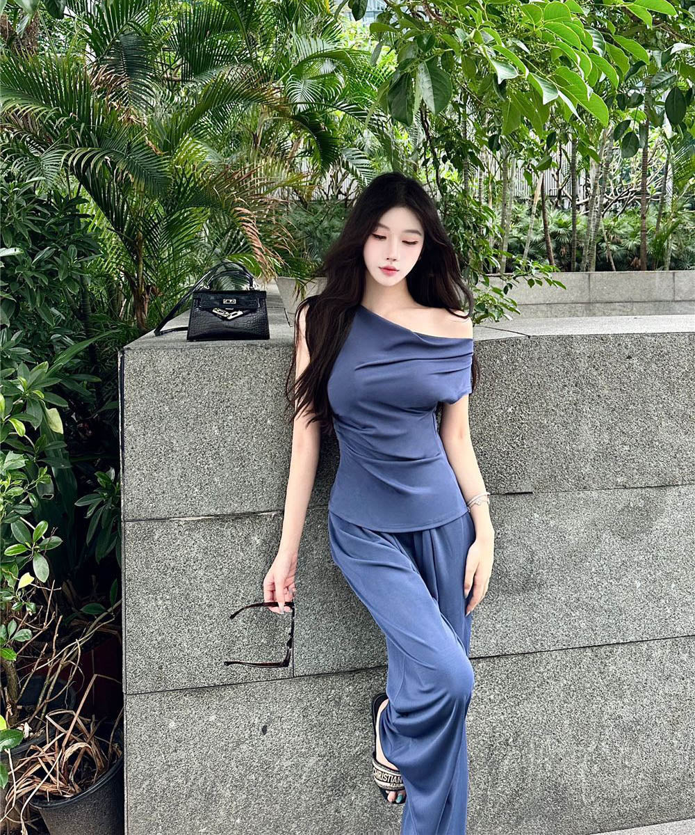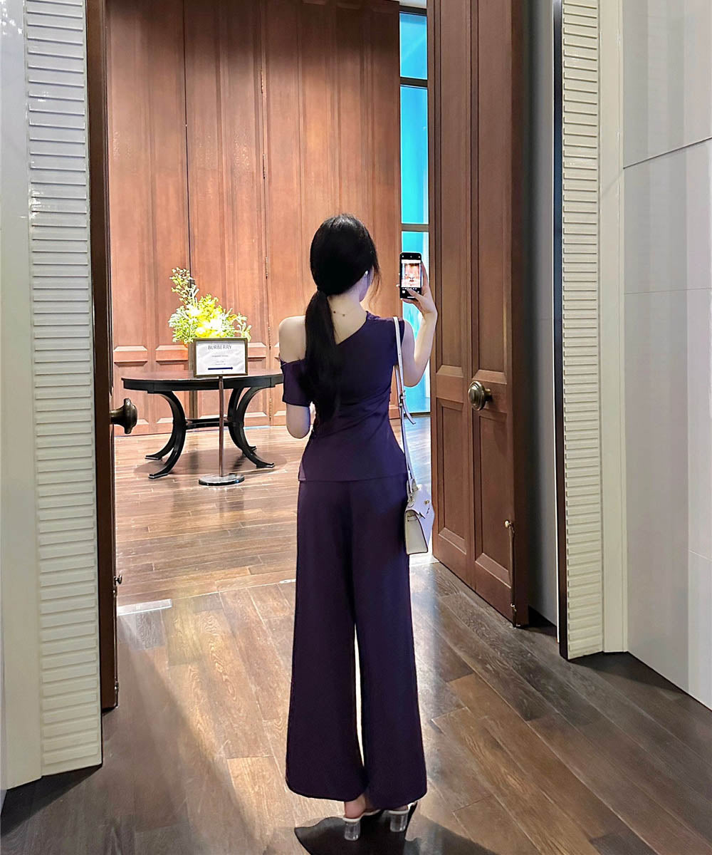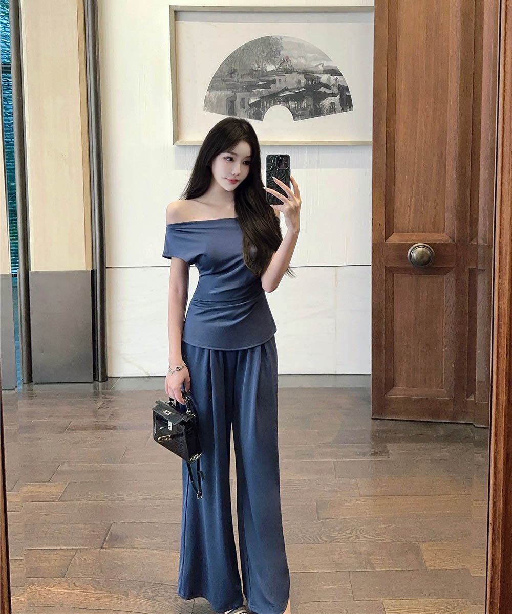 【2色】上下セットワイドパンツエレガントセクシーオフショルダー通勤女子力着痩せ気質同伴個性感 WQ2-DD4818