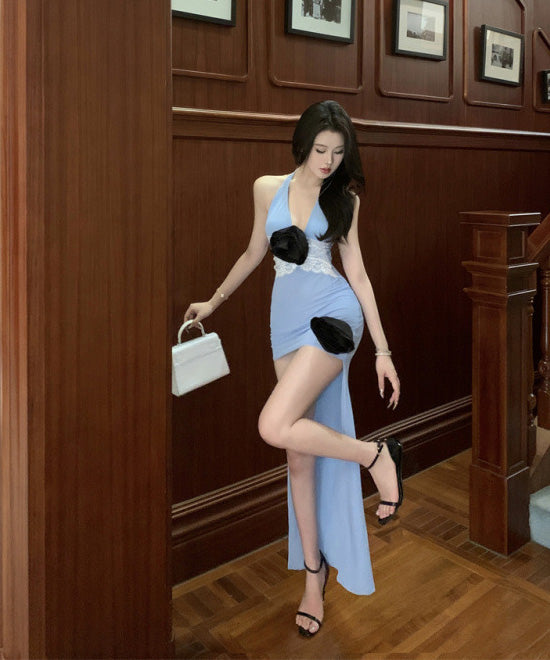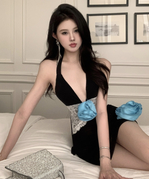 【2色】前ミニドレスミニドレスホルターネックセクシーレースフラワー気質不規則ナイトクラブ WQ2-ZED882268DXH437A