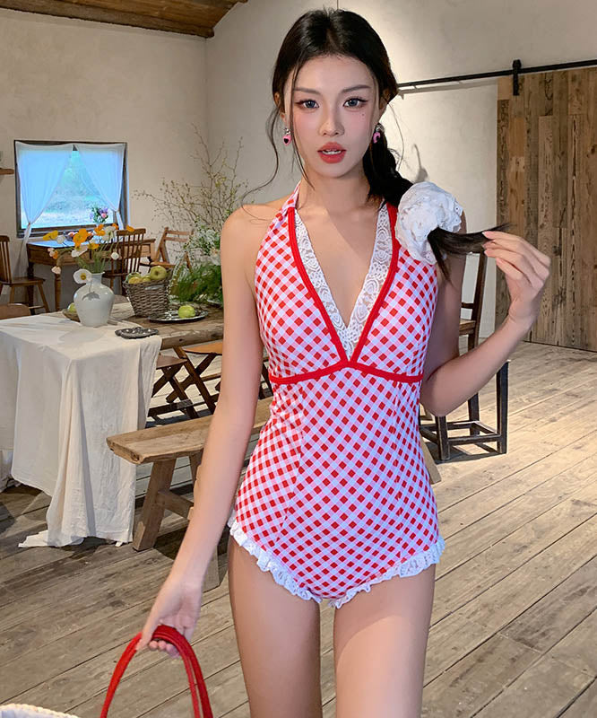 【2色】水着ビキニモノキニタンキニ体型カバーホルターネックセクシー谷間見せチック柄温泉ビーチ海旅行 WQ7-FH-qing001