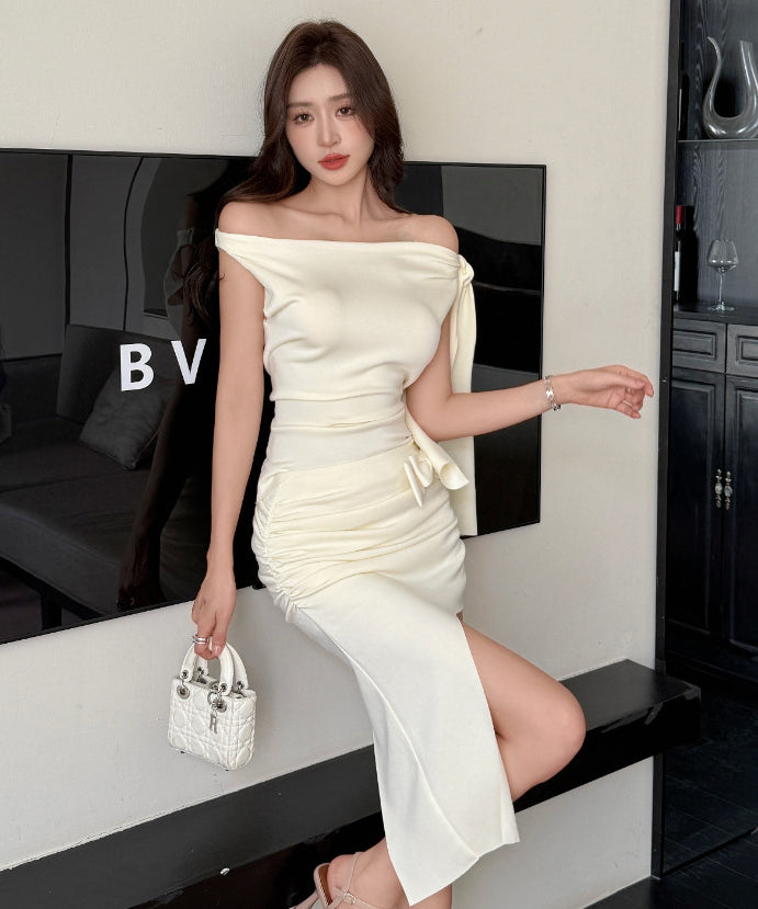 【2色】膝丈ドレスオフショルダーエレガント非対称セクシーおしゃれ同伴気質リボン WQ2-ZED889854GT347
