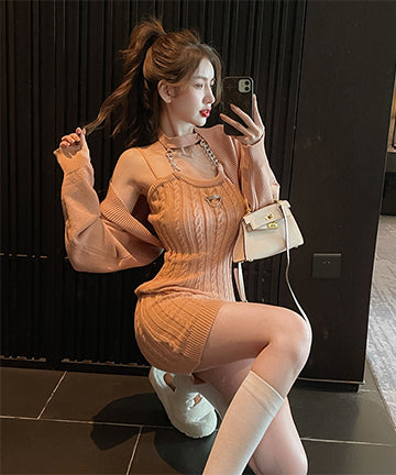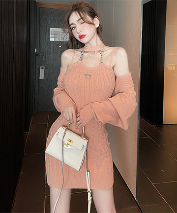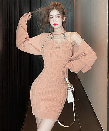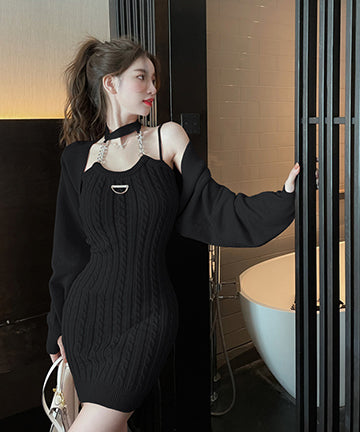【2色】2点セット ニットワンピース セクシー 淑女 ホルターネック 可愛い 姉 XH2-ZED882220GT510
