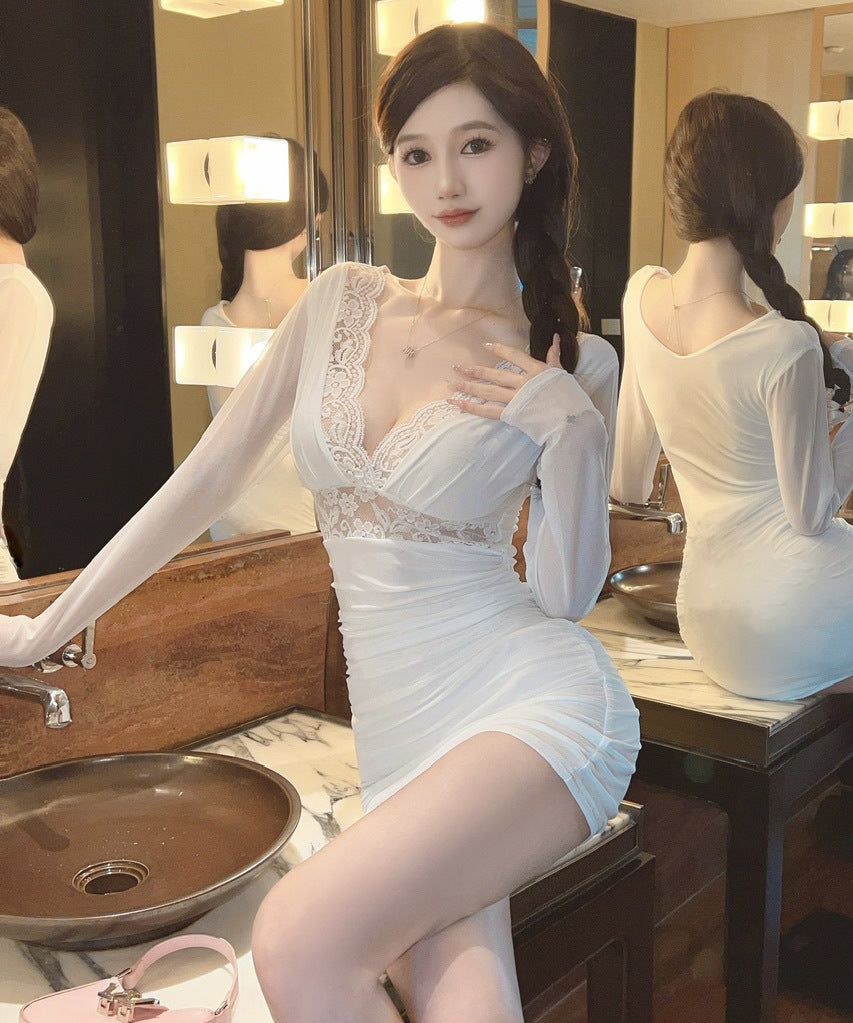 【3色】ミニドレス キャバドレス 透け感 レース 長袖 着痩せ MY2-LQE7681