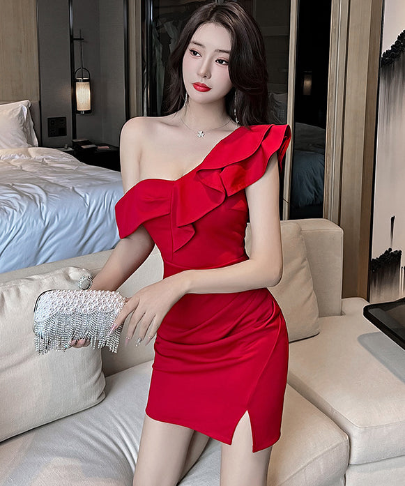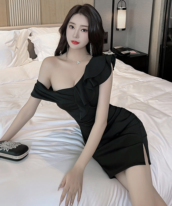 【3色】ミニドレス セクシー キャバドレス ワンショルダー フリル 着瘦せ XH2-LQE5962GT536