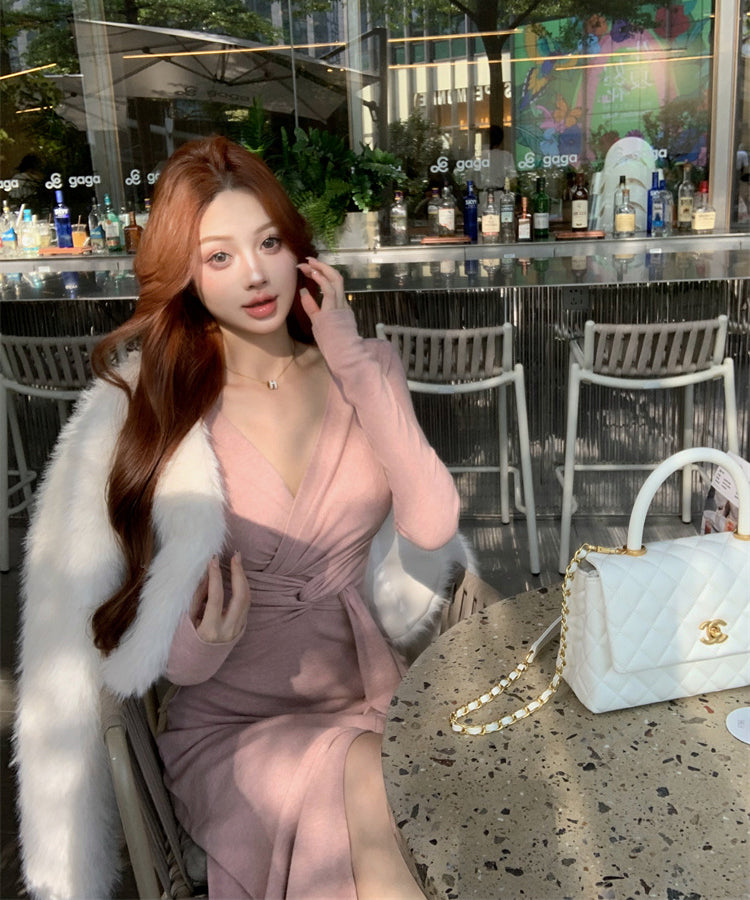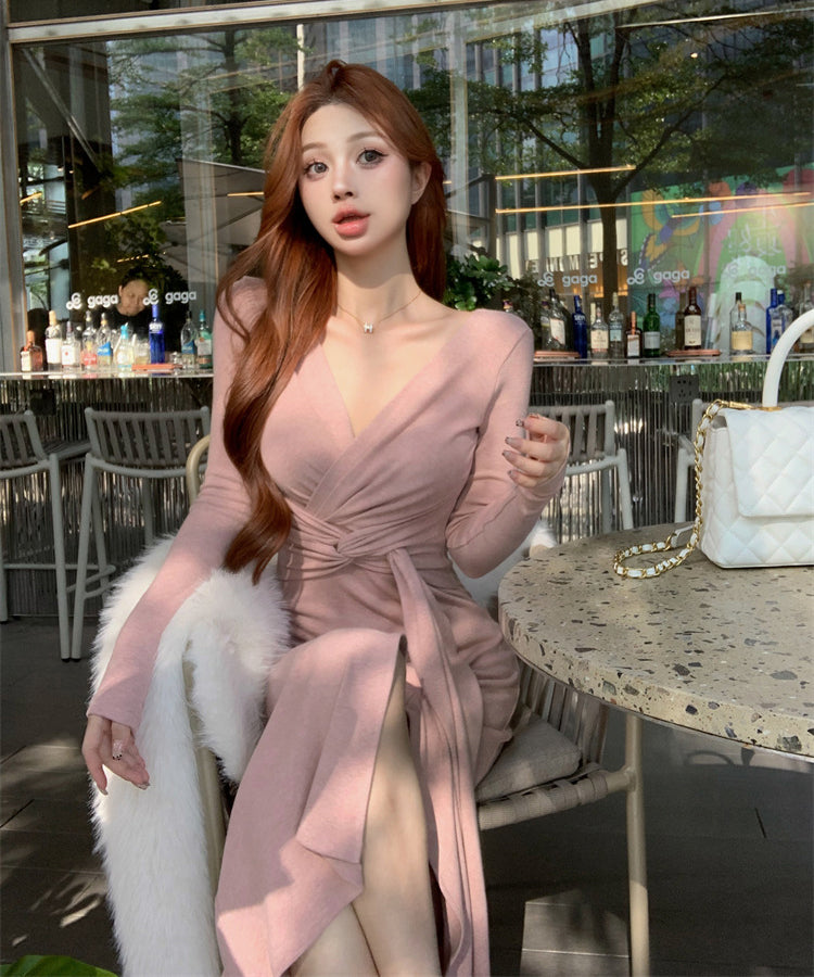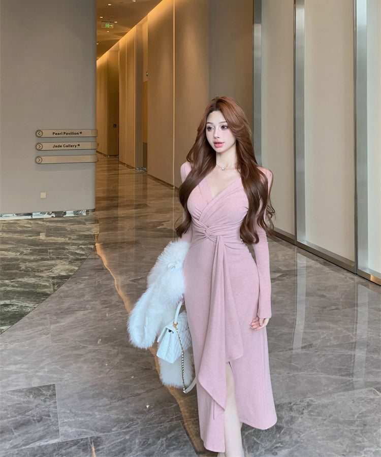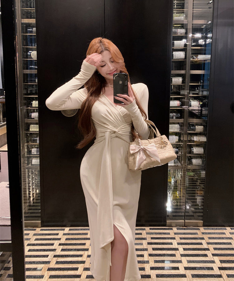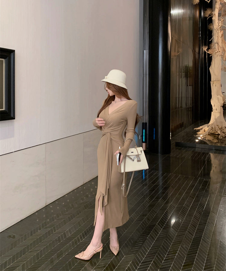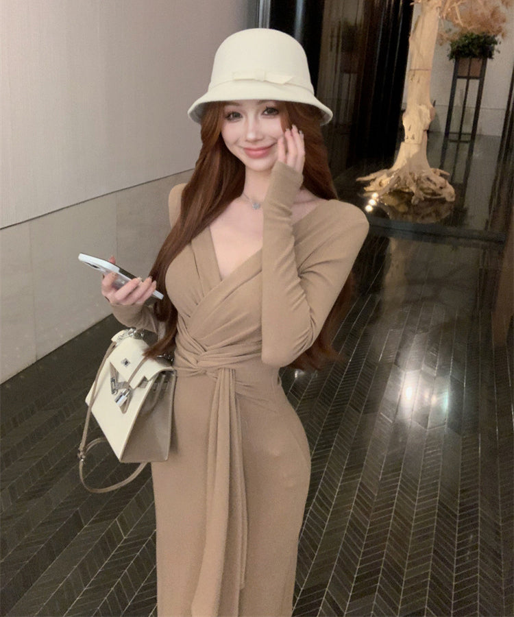【3色】ロングドレス キャバドレス セクシー 秋冬 大人カジュアル シェイプアップ Vネック ノット 結び目 デート パーティー JC2-XKDD355-5887-Aug27