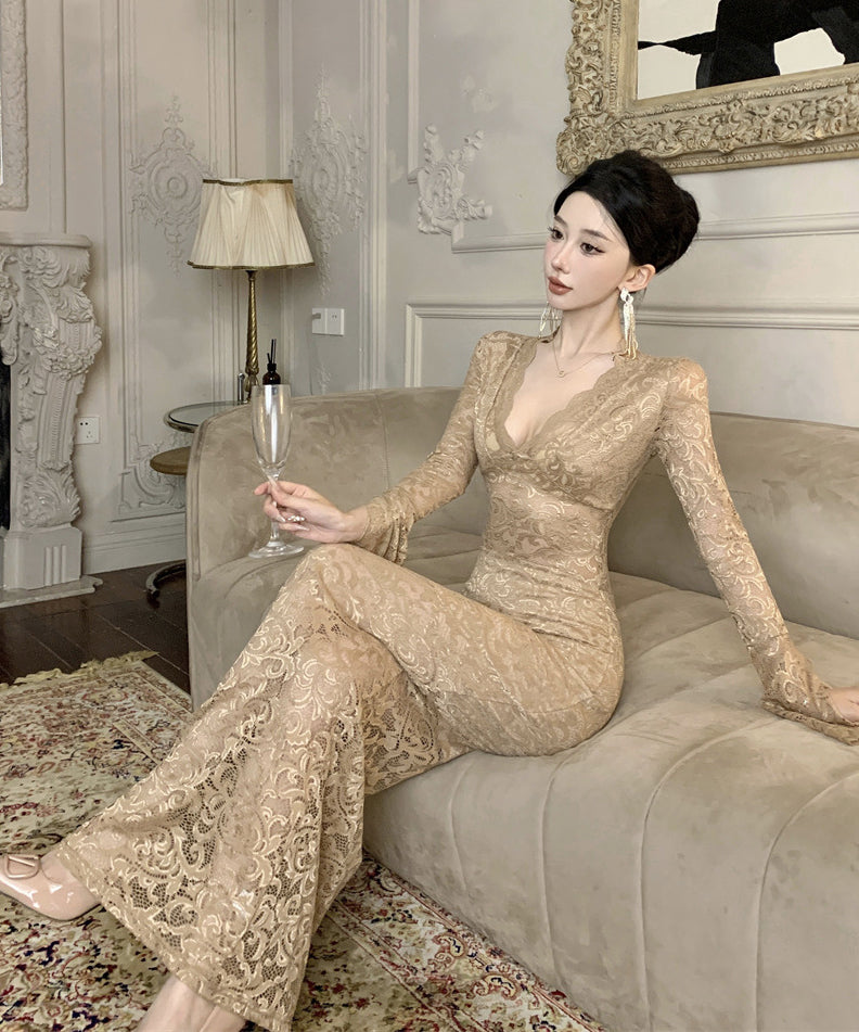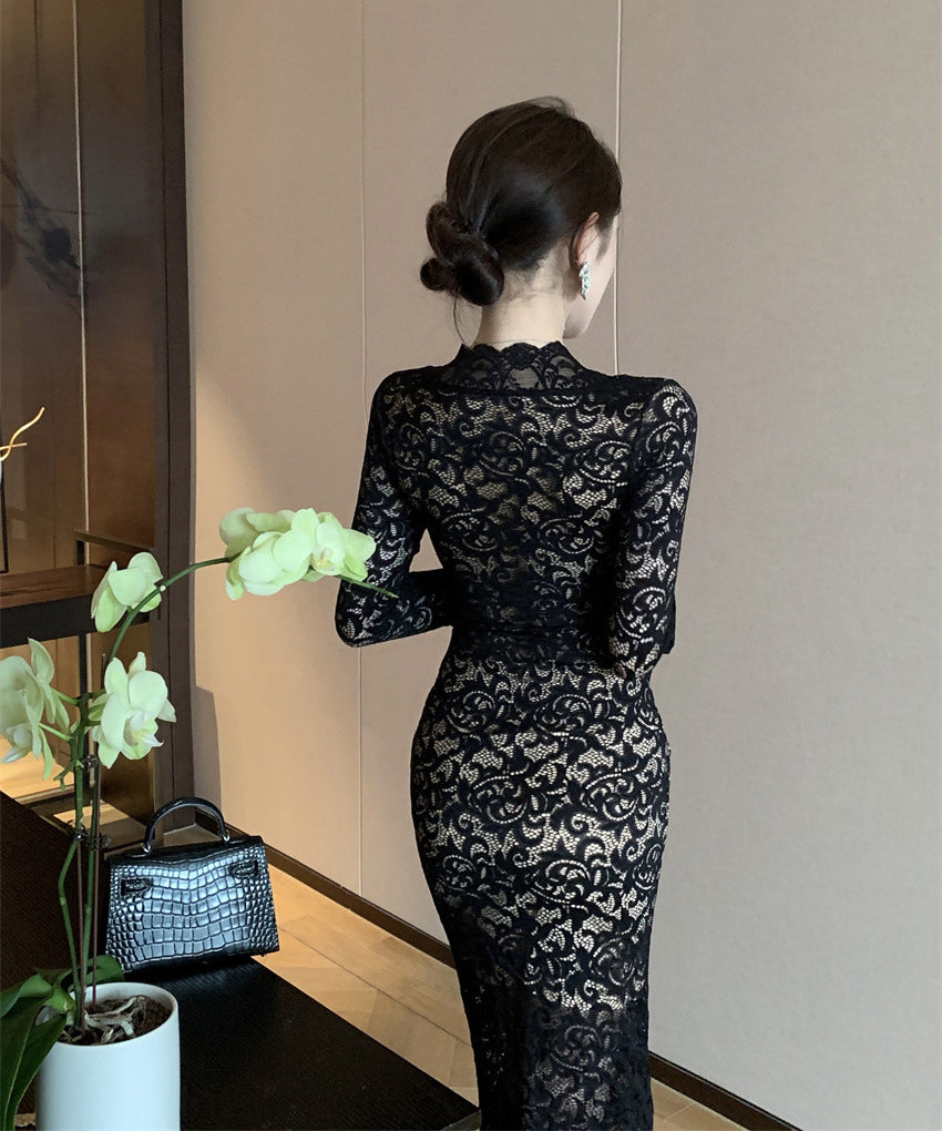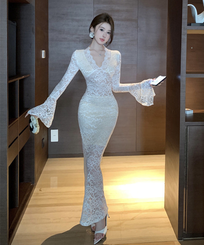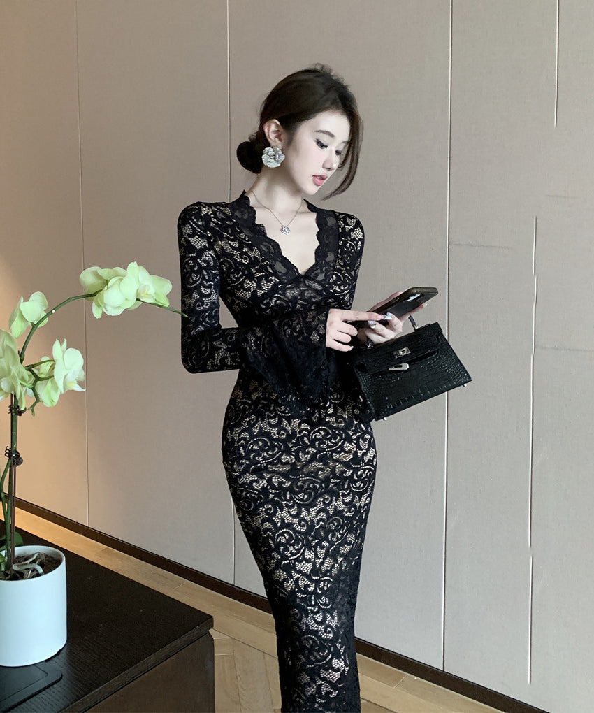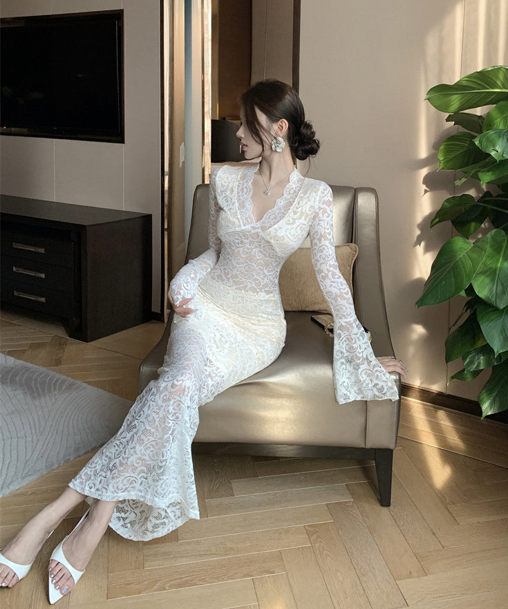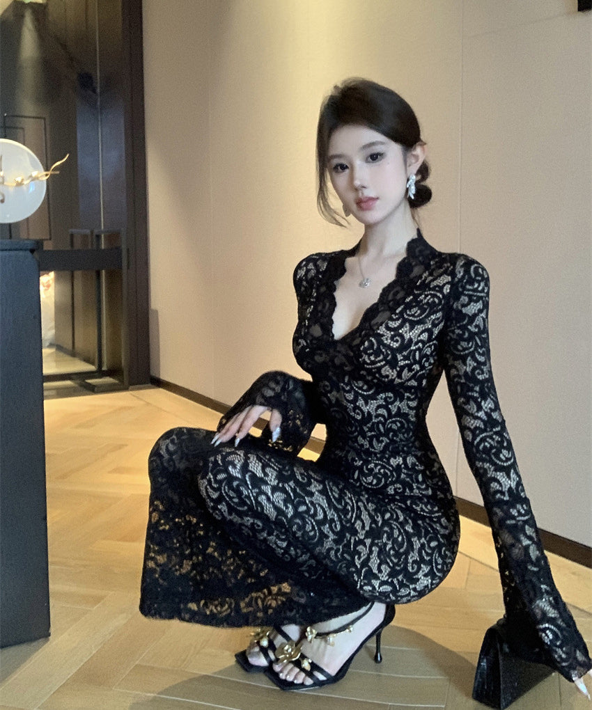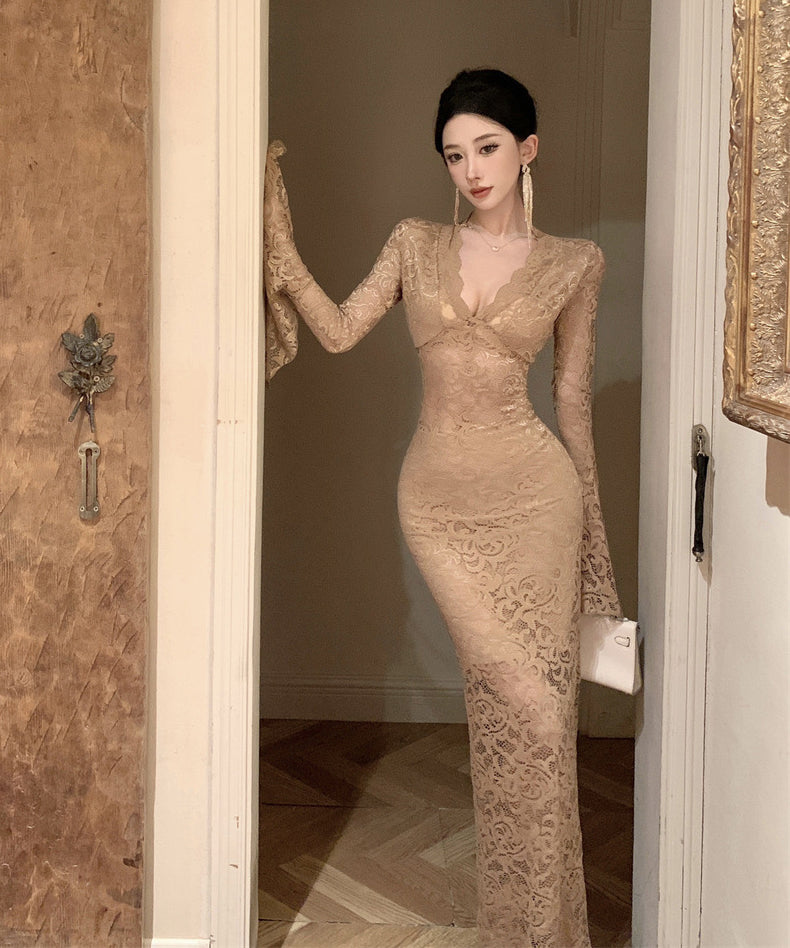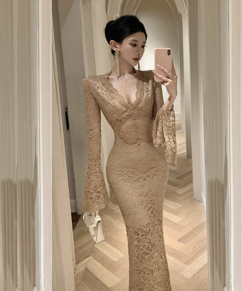 【3色】ロングドレス 総レース Vネック 小顔 エレガント 気質 宴会 袖付き XH2-ZED885535DXH238B