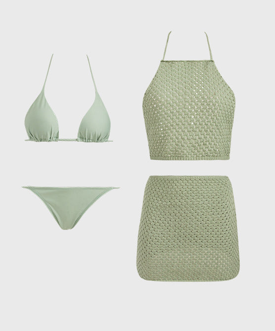 【4点セット】2色 三角ビキニ水着ワンピースクロシェ編み hot girl ホルターネックセクシーSNS話題 WQ7-DP-A10394