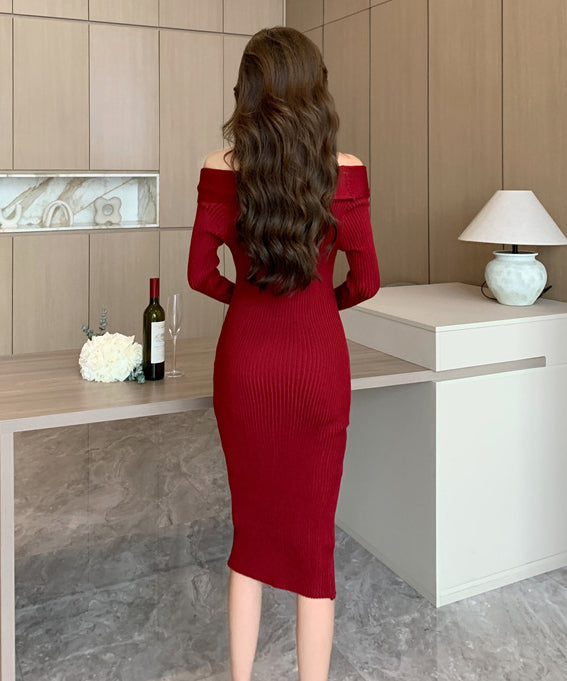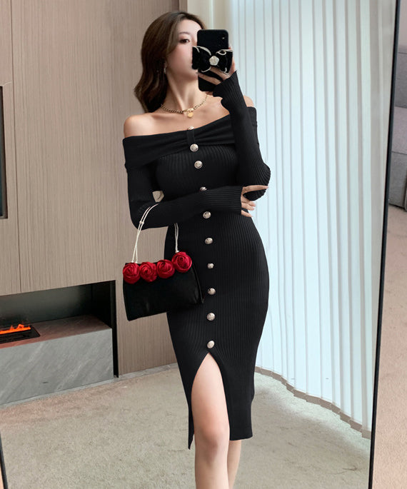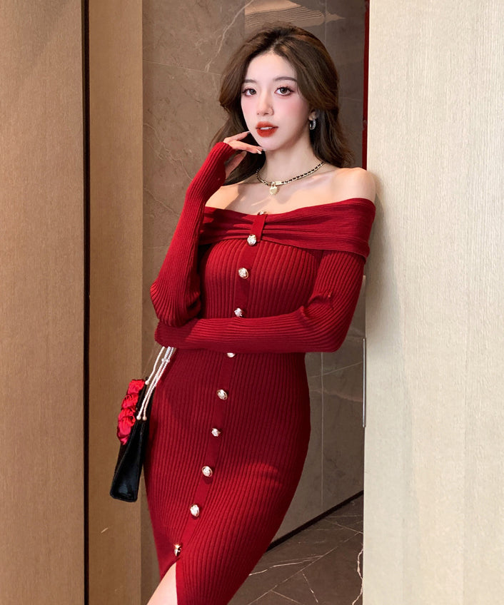 【4色】ニットドレス オフショルダー セクシー 着瘦せ 袖付き エレガント XH2-ZED883071BH453