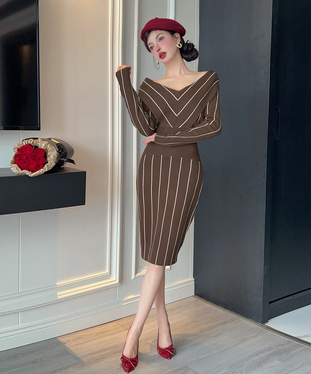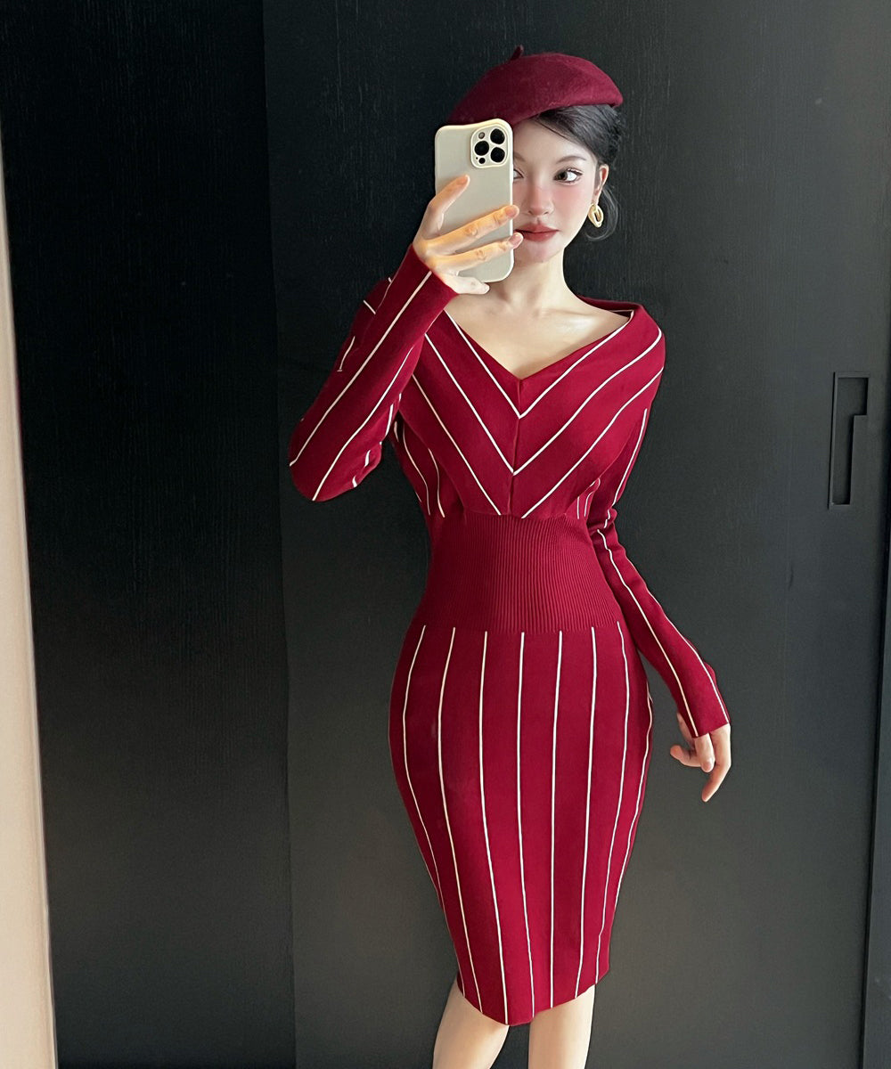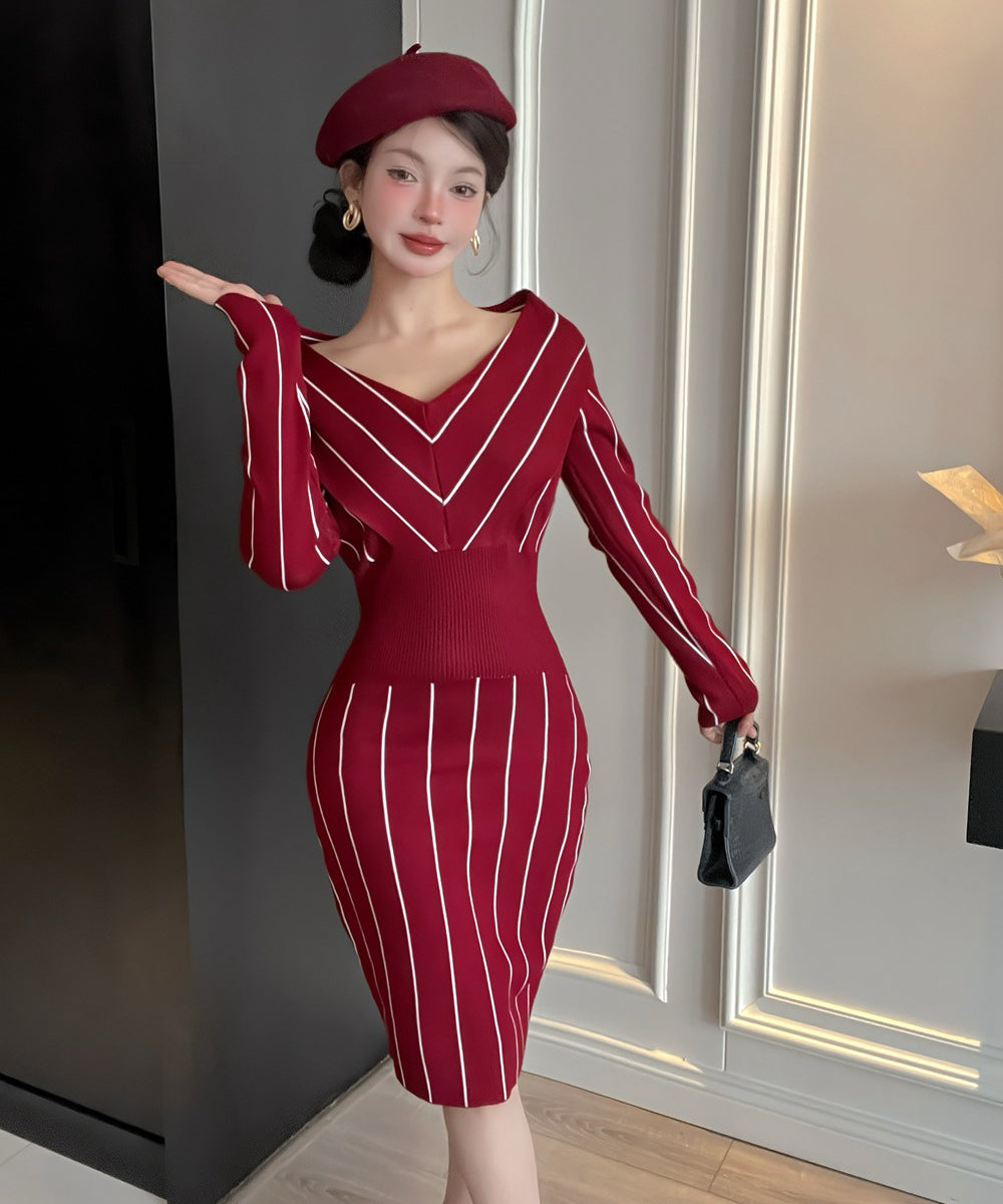 【5色】膝丈ドレス キャバドレス 上品Vネック 配色 ニットワンピース エレガント 大人可愛い ツイード風 長袖 JC2-DD5603