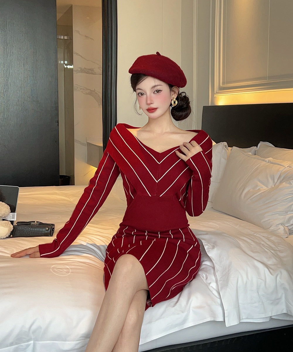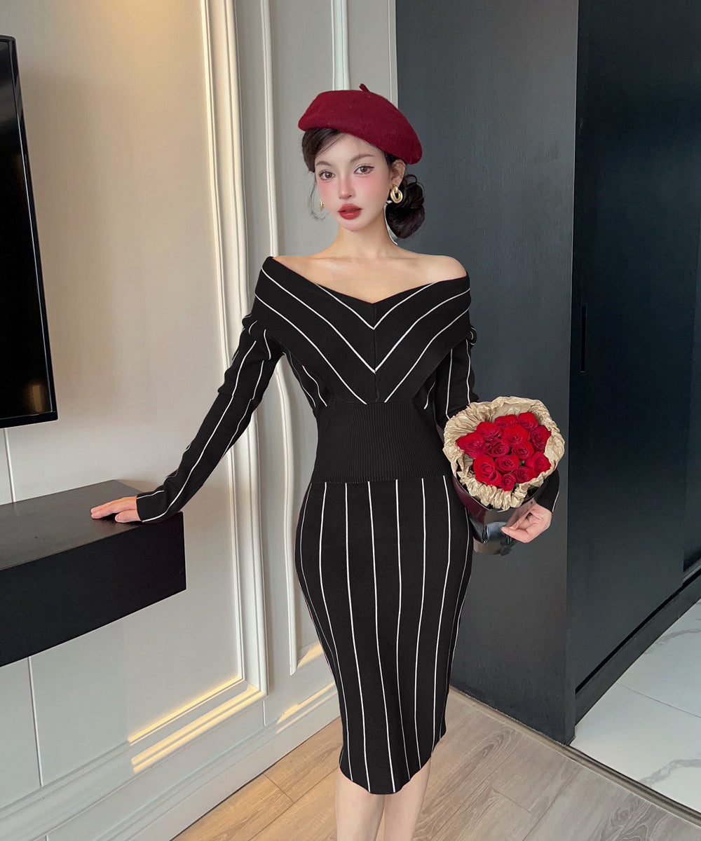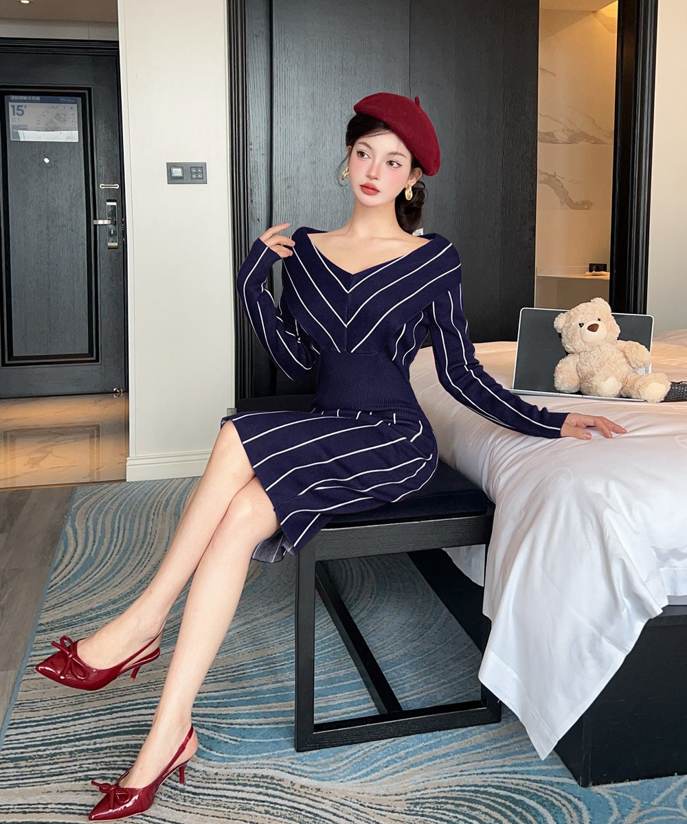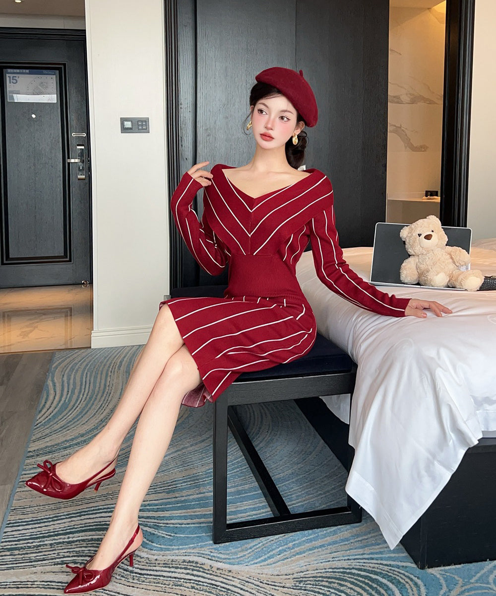 【5色】膝丈ドレス キャバドレス 上品Vネック 配色 ニットワンピース エレガント 大人可愛い ツイード風 長袖 JC2-DD5603