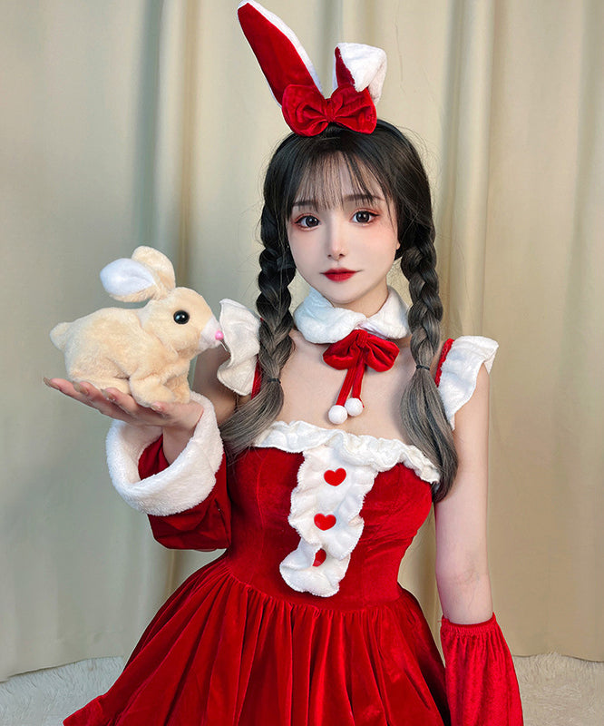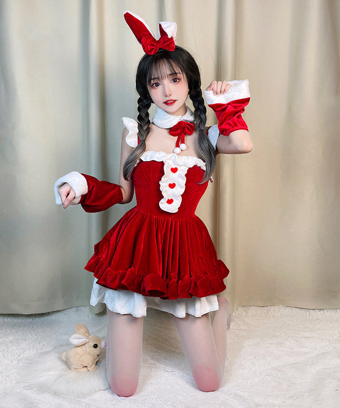 セット内容:レッドドレス+ホワイトスカート+チョーカー+ヘアバンド+アームカバー*2+バニーテール