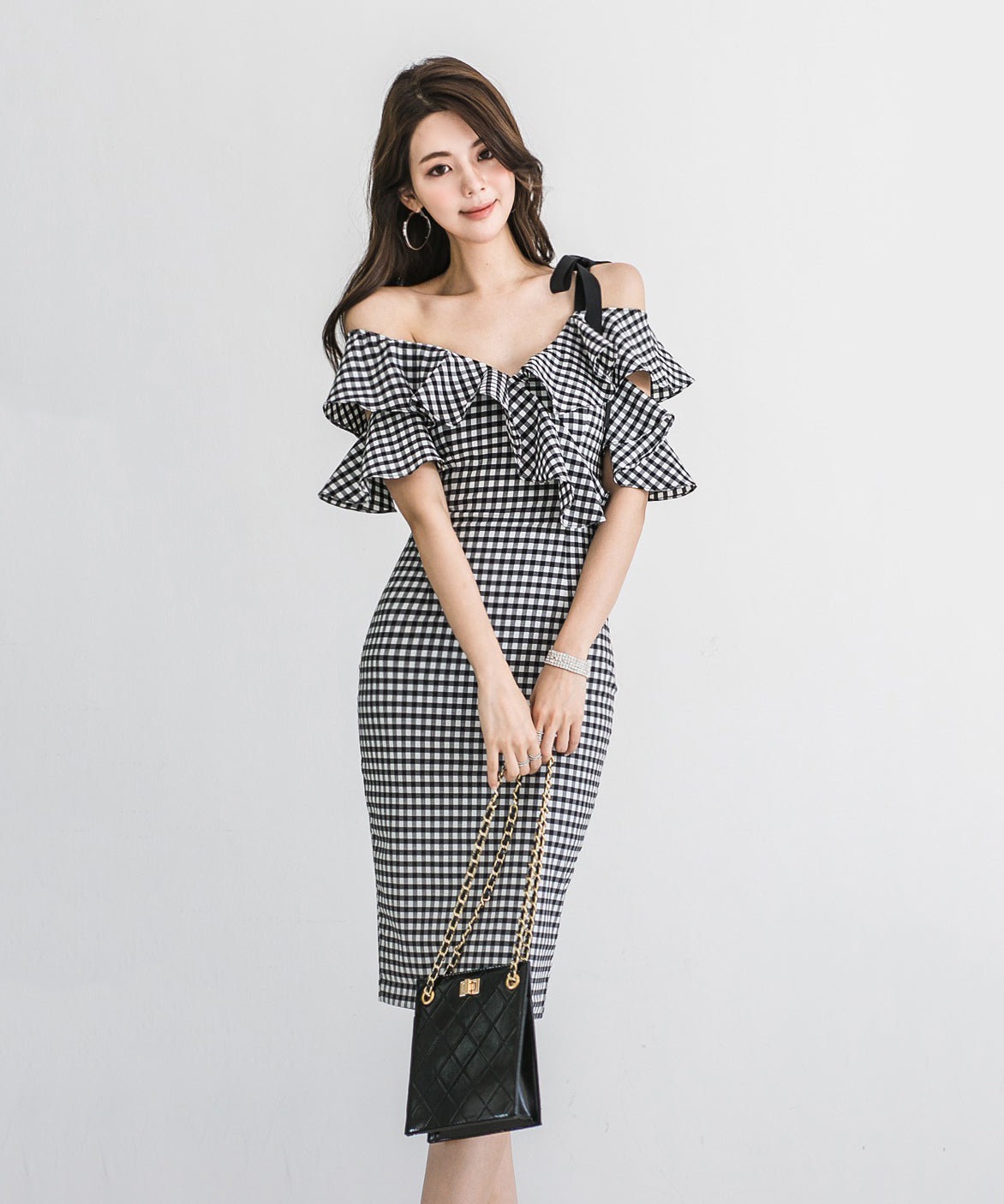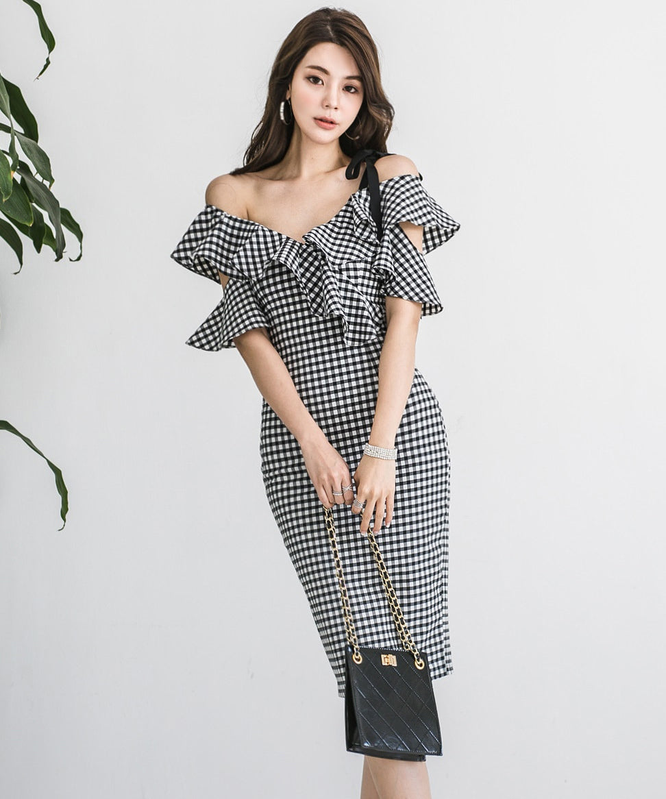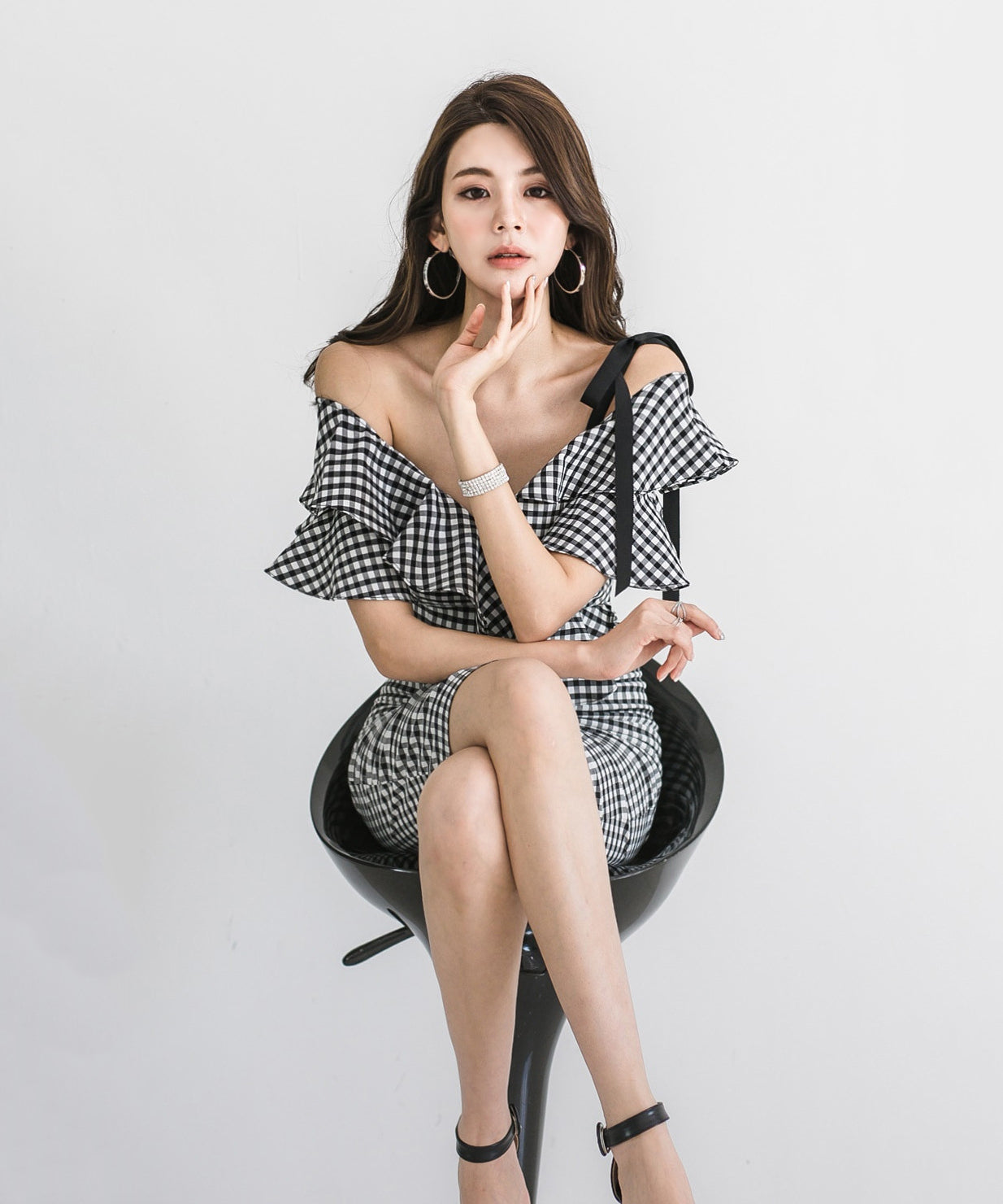 新作 チェック柄 フリル ノーショルダー セクシー ゴージャス 高見え パーティードレス ミニドレス LQE9091BM131