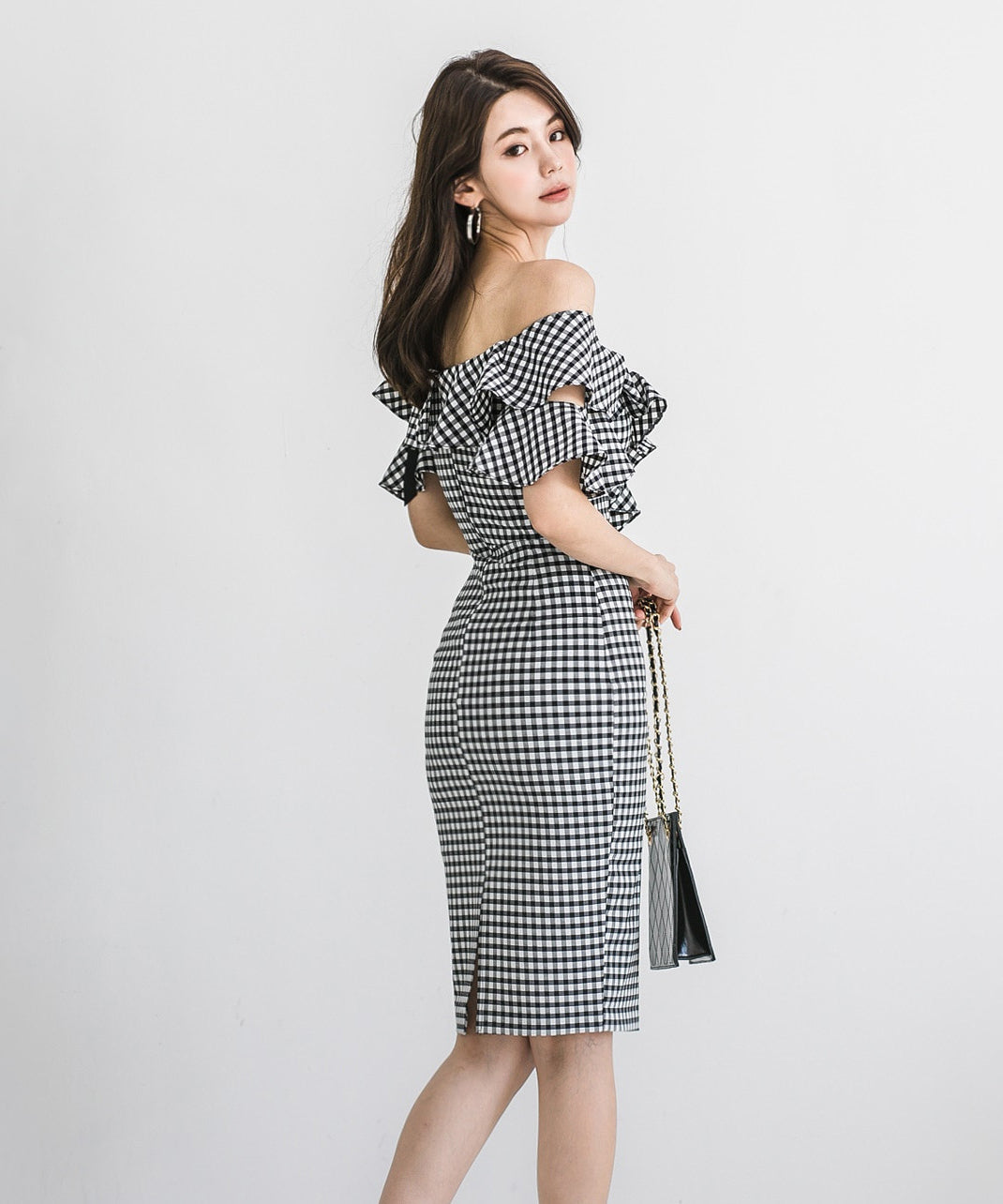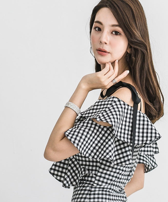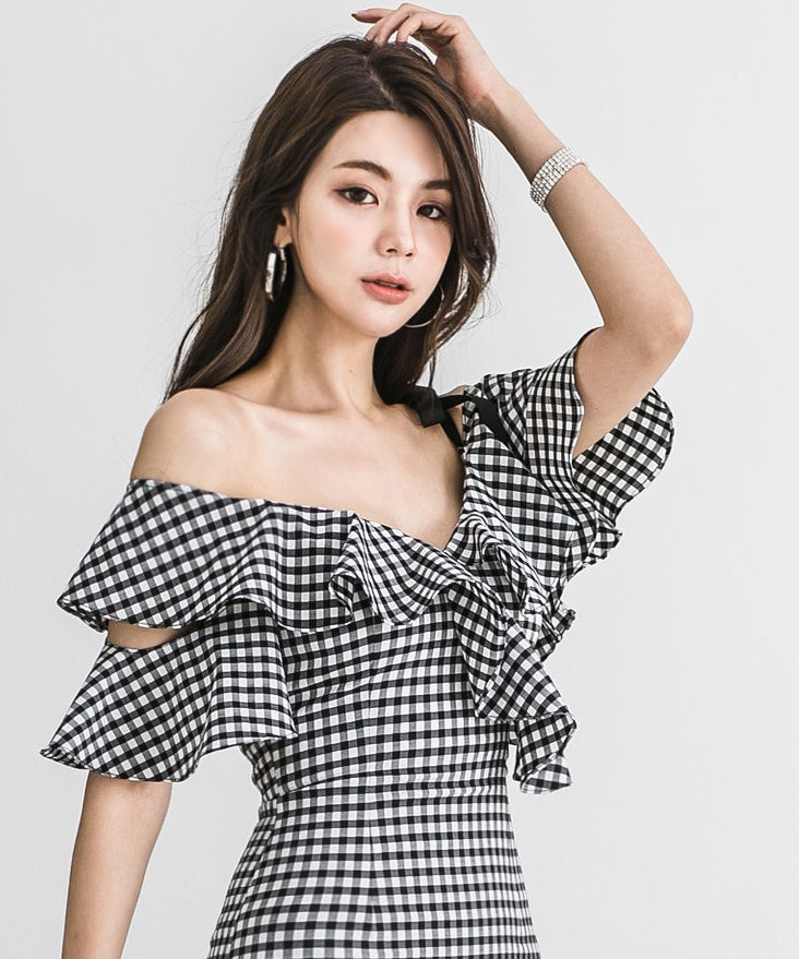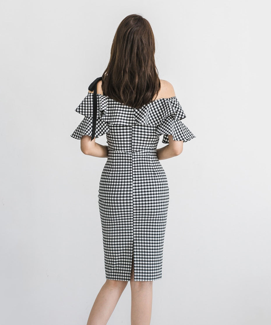 新作 チェック柄 フリル ノーショルダー セクシー ゴージャス 高見え パーティードレス ミニドレス LQE9091BM131