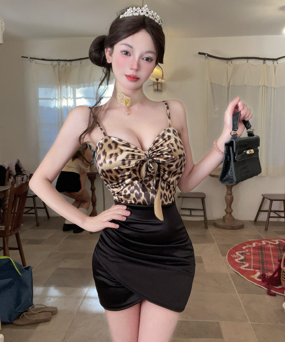 【2色】ミニドレス キャバドレス セクシー キャミソール レオパード柄 バイカラー サテン ヒップライン クラブ JC2-DD6361