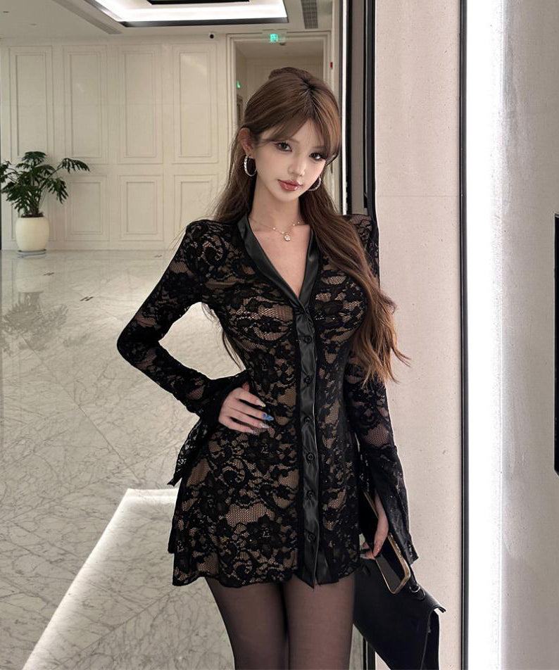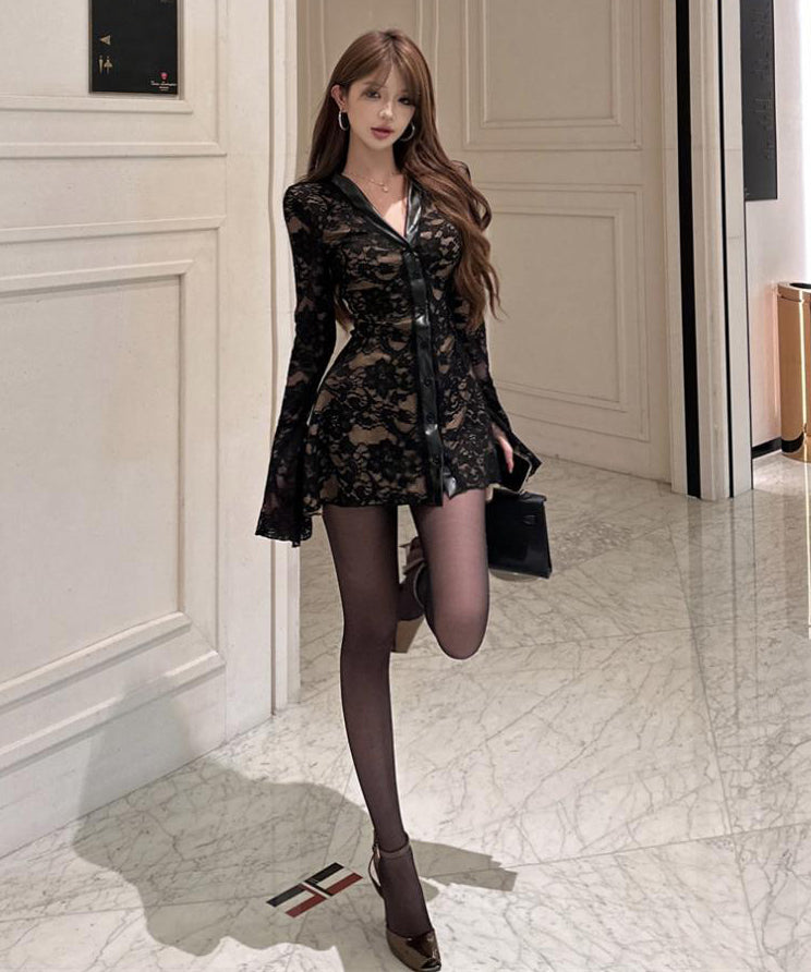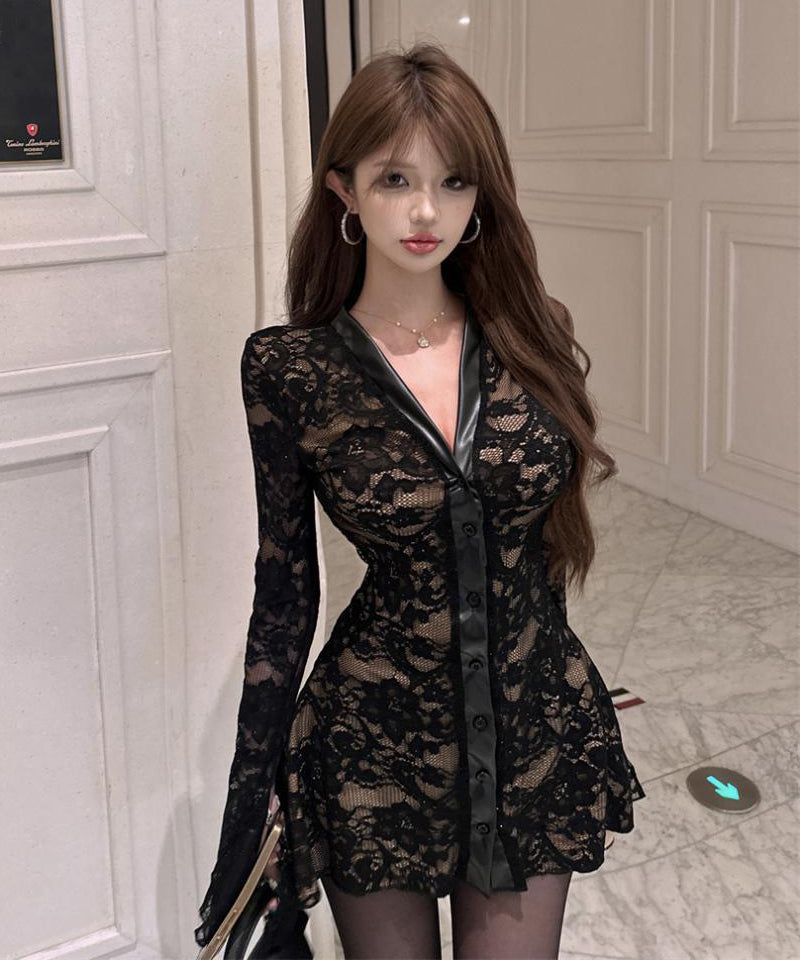 ミニドレス キャバドレス セクシー レース切り替え Vネック フレアスリーブ ボディコン デート お出かけ JC2-ZED886967DXH411