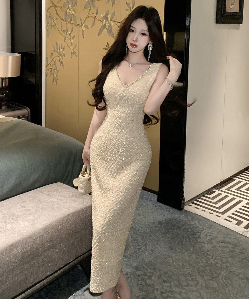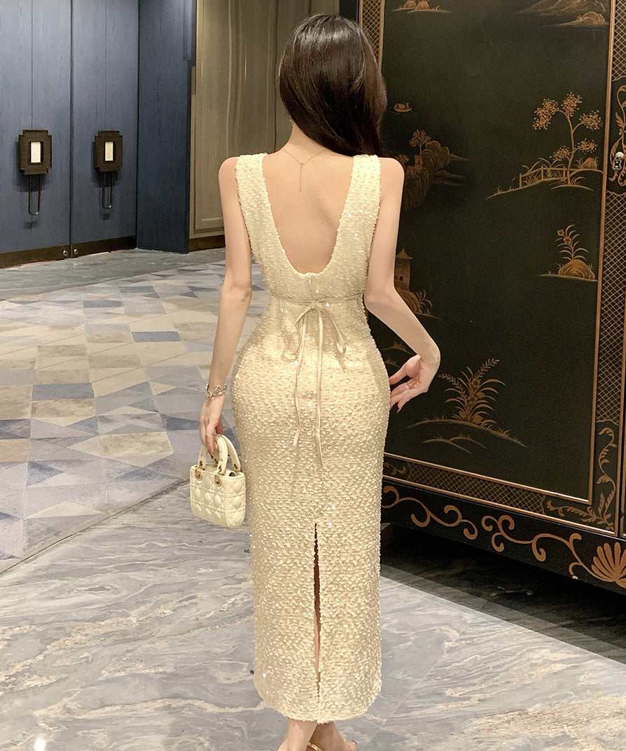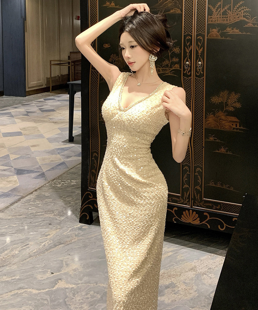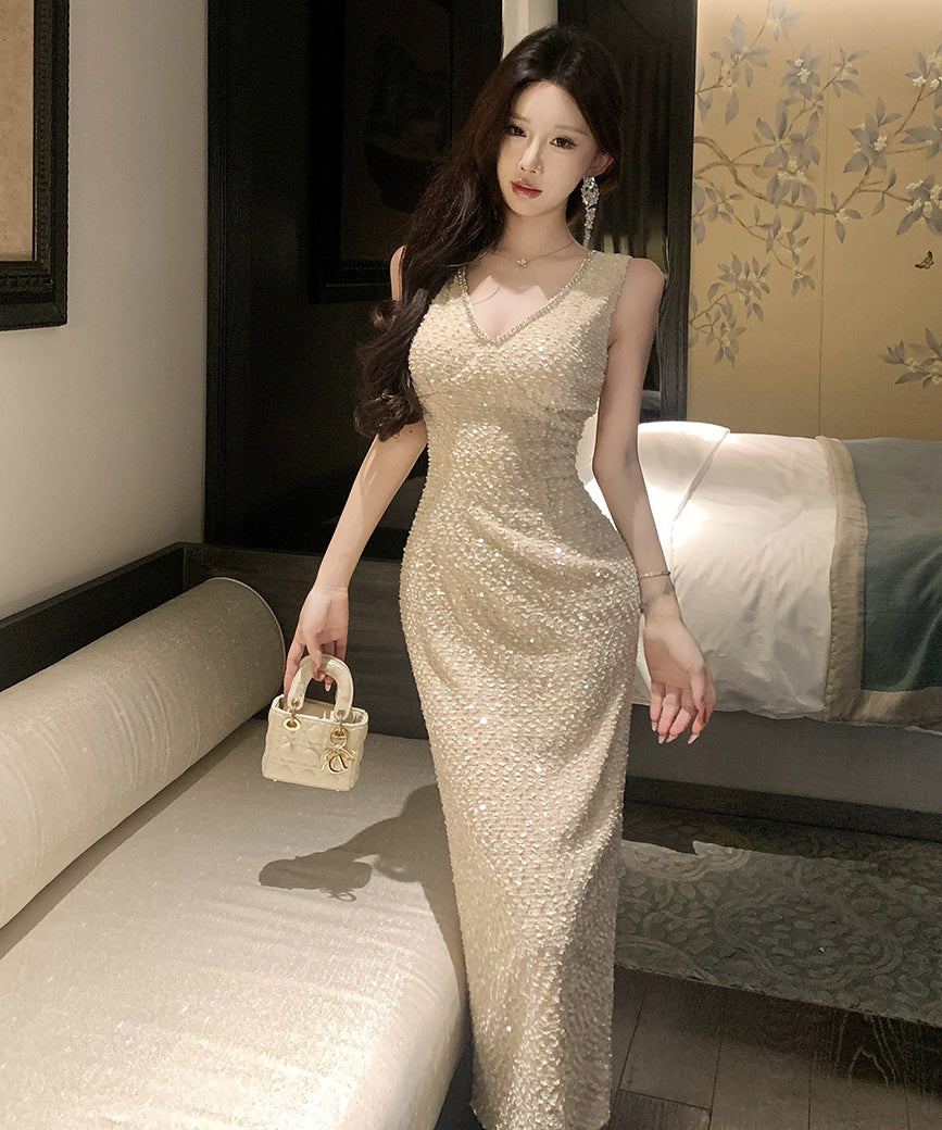 ロングドレス キャバドレス セクシー Vネック バックオープン スリット入り キラキラ JC2-WDS5562