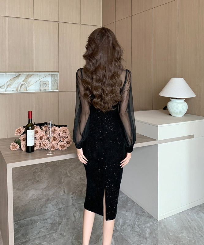 膝丈ドレス キャバドレス セクシー レトロ風 長袖 チュール スパンコール ベルベット スリット入り ボディコン JC2-WDS5570